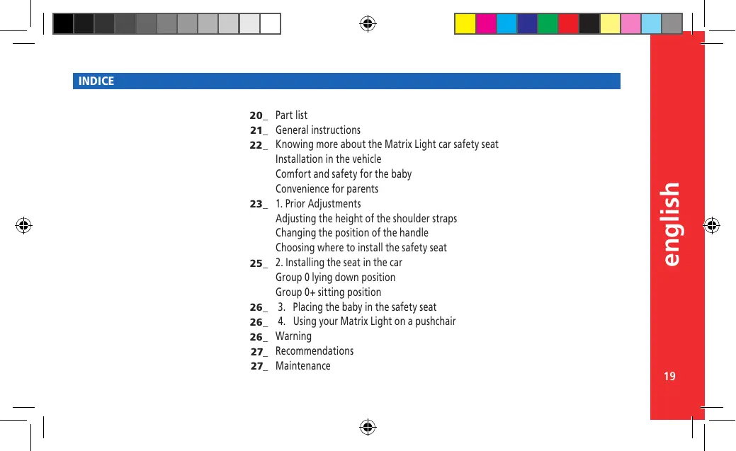 Warning Recommendations Maintenance english 20_ Part list 21_ General instructions 22_ Knowing more about the Matrix Light car safety seat