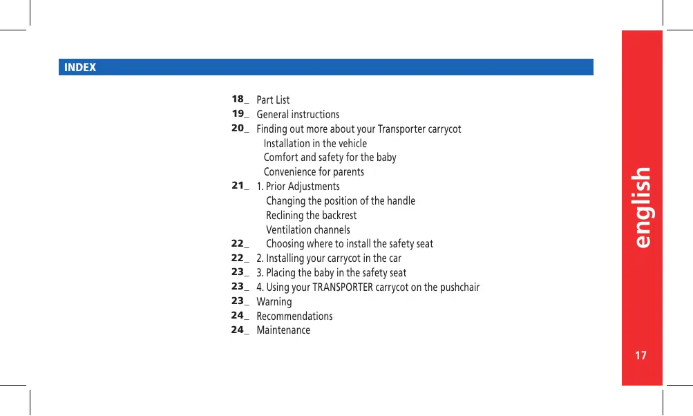 Warning Recommendations Maintenance english 18_ Part List 19_ General instructions 20_ Finding out more about your Transporter carrycot