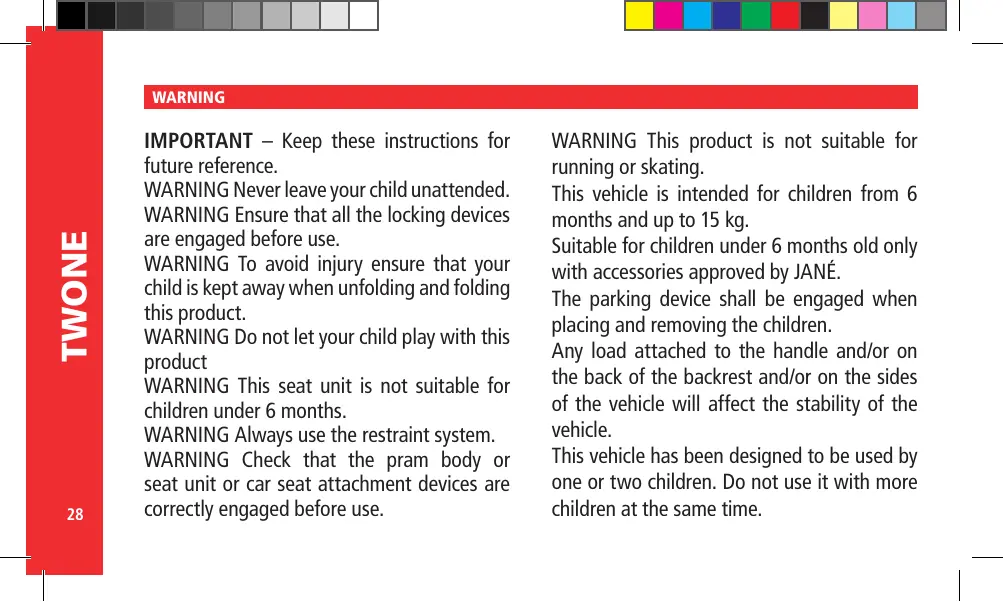 This vehicle is intended for children from 6 months and up to 15 kg. Suitable for children under 6 months old only with accessories approved by JANÉ. The parking device shall be engaged when placing and removing the children. Any load attached to the handle and/or on the back of the backrest and/or on the sides of the vehicle will affect the stability of the vehicle. This vehicle has been designed to be used by one or two children. Do not use it with more children at the same time.