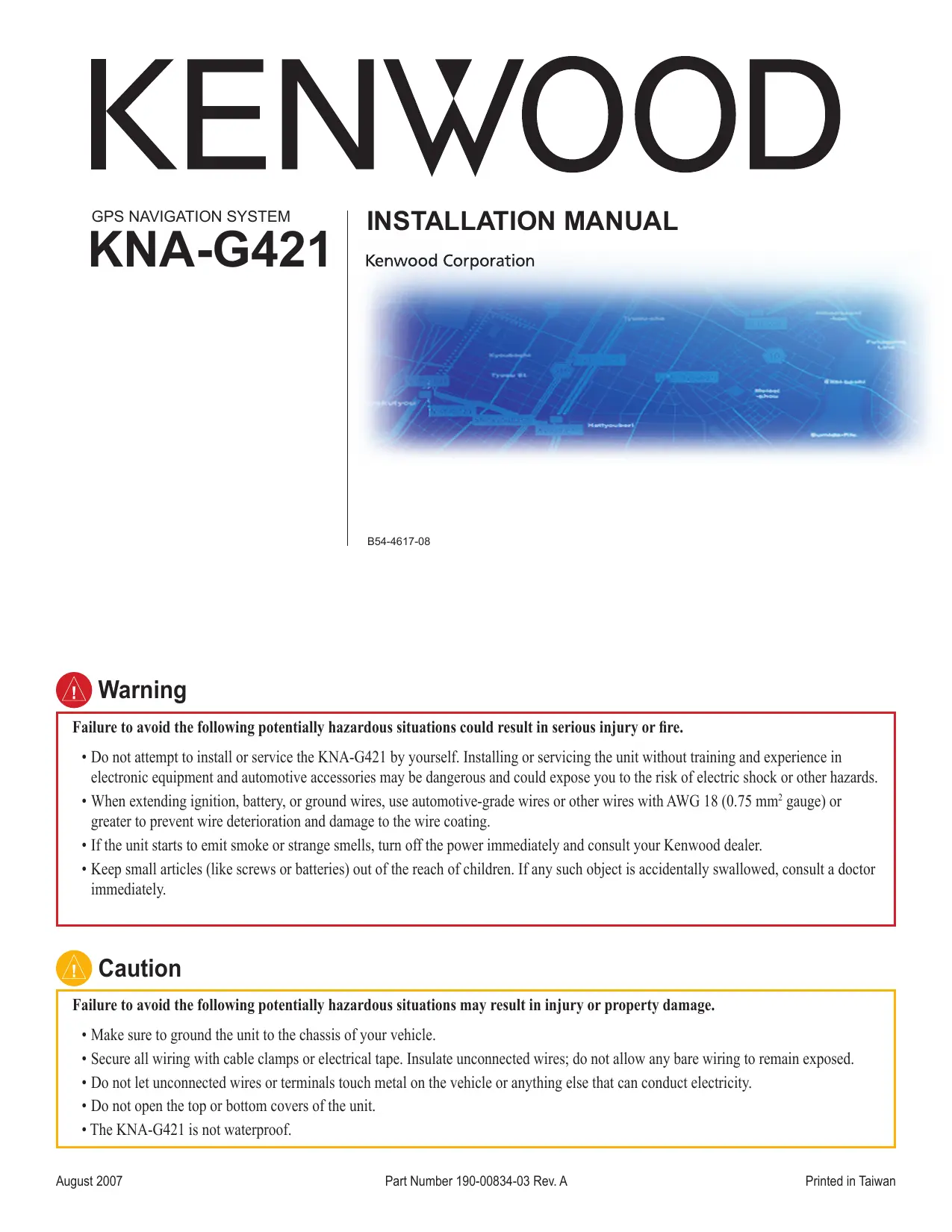 Failure to avoid the following potentially hazardous situations may result in injury or property damage. • Make sure to ground the unit to the chassis of your vehicle. • Secure all wiring with cable clamps or electrical tape. Insulate unconnected wires; do not allow any bare wiring to remain exposed. • Do not let unconnected wires or terminals touch metal on the vehicle or anything else that can conduct electricity. • Do not open the top or bottom covers of the unit. • The KNA-G421 is not waterproof. August 2007