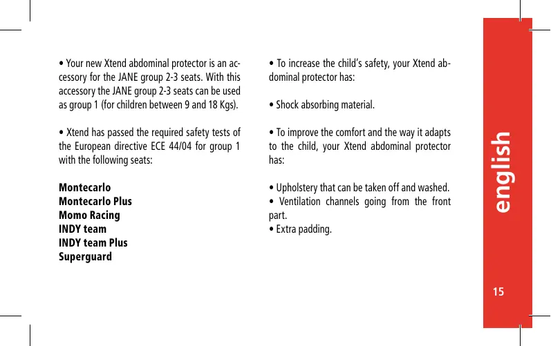 - Your new Xtend abdominal protector is an accessory for the JANE group 2-3 seats. With this accessory the JANE group 2-3 seats can be used as group 1 (for children between 9 and 18 Kgs).