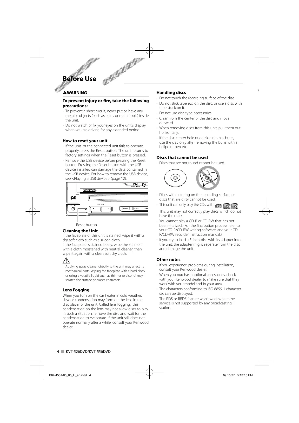 Applying spray cleaner directly ta the unit may affect its mechanical parts. Wiping the faceplate with a hard cloth or using a volatile liquid such as thinner or alcohol may scratch the surface or erases characters. Lens Fogging When you turn on the car heater in cold weather, dew or condensation may form on the lens in the disc player ofthe unit. Called lens fogging, this condensation on the lens may not allow discs to play. In such a situation, remove the disc and wait for the condensation to evaporate. If the unit still does not operate normally after a while, consult your Kenwood dealer.