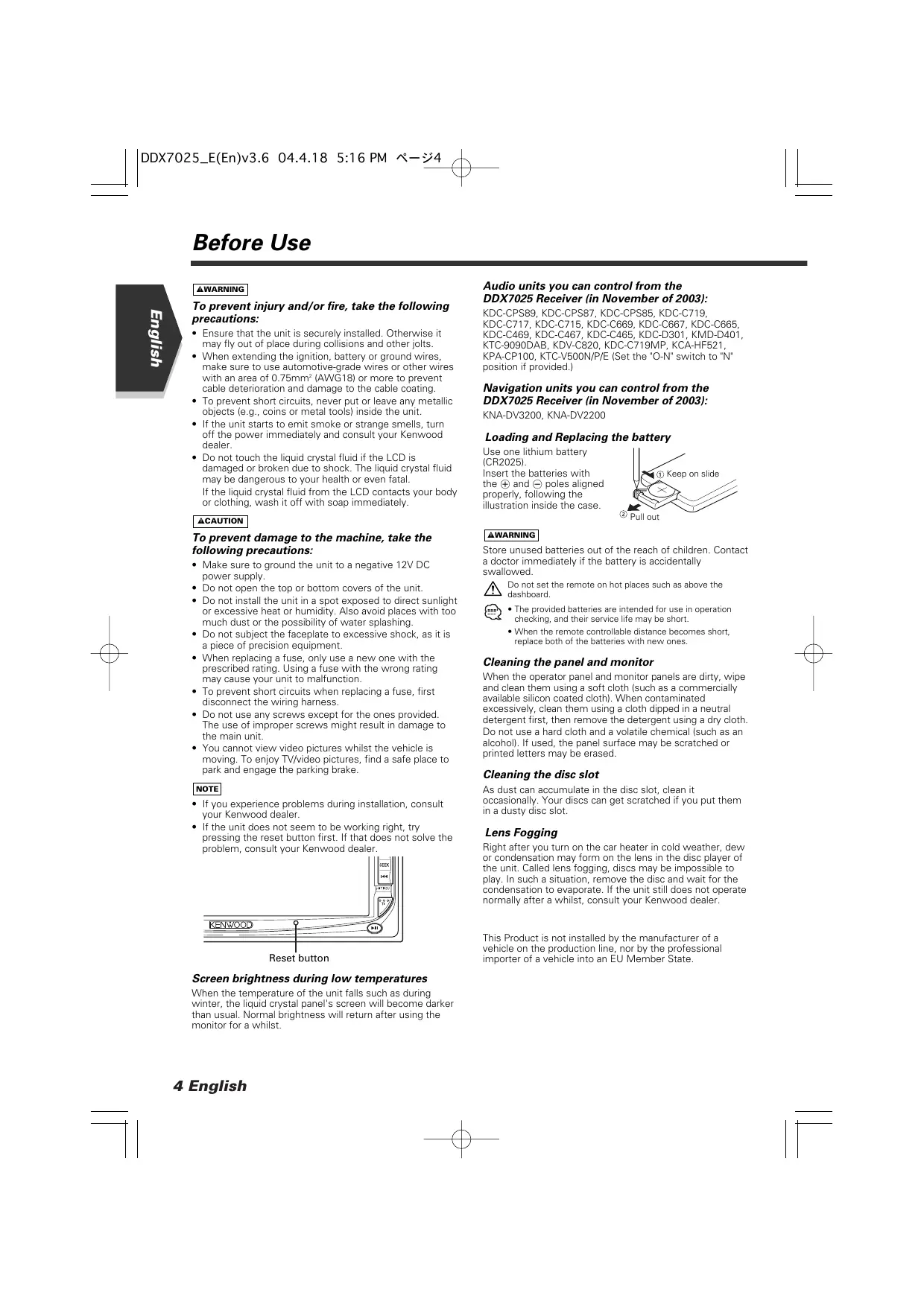 Reset button Screen brightness during low temperatures When the temperature of the unit falls such as during winter, the liquid crystal panel's screen will become darker than usual. Normal brighiness will return after using the monitor for à whilst 4 English Audio units you can control from the DDX7025 Receiver (in November of 2003): KDC-CPS89, KDC-CPS87, KDC-CPS85, KDC-C719, KDC-C717, KDC-C715, KDC-C669, KDC-C667, KDC-C665, KDC-CA69, KDC-CA67, KDC-C465, KDC-D301, KMD-D401, KTC-9090DAB, KDV-C820, KDC-C719MP, KCA-HFS21, KPA-CP100, KTC-VS00N/P/E (Set the O-N' switch to "N° position if provided | Navigation units you can control from the DDX7025 Receiver [in November of 2003): KNA-DV3200, KNA-DV2200 Loading and Replacing the battery Use one lithium battery (CR2025) Insert the batteries with Es ‘on slide: the ® and © poles aligned Ÿ £ proper, fallowing the illustration inside the case. S'Pull out Store unused batteries out of the reach of children. Contact 2 doctor immediately if the battery is accidentally swallowed Do not set the remote on hot places such as above the dashboard. + The provided batteries ar intended for use in operation checking, and thaï service fe may be short. + When the remote contrllable distance becomes short, replace both of 1he batteries with new ones. À à u —<- Cleaning the panel and monitor Le When the operator panel and monitor panels are dirty, wipe and clean them using a soft cloth (such as a commercially available silicon coated cloth}. When contaminated excessively, clean them using a cloth dipped in a neutral detergent first, then remove the detergent using a dry cloth. Do not use a hard cloth and a volatile chemical (such as an alcoholl. If used, the panel surface may be scratched or printed letters may be erased Cleaning the disc slot As dust can accumulate in the disc slot, clean it occasionally. Your discs can get scratched if you put them in a dusty disc slot Lens Fogging Right after You turn on the car heater in cold weather, dewr or condensation may form on the lens in the disc player of the unit. Called lens fogging, discs may be impossible to play. In such a situation, remove the disc and wait for the condensation to evaporate. If the unit stil does not operate normally after a whilst, consul your Kenwood dealer. This Product is not installed by the manufacturer of a vehicle on the production line, nor by the professional importer of a vehicle into an EU Member State.