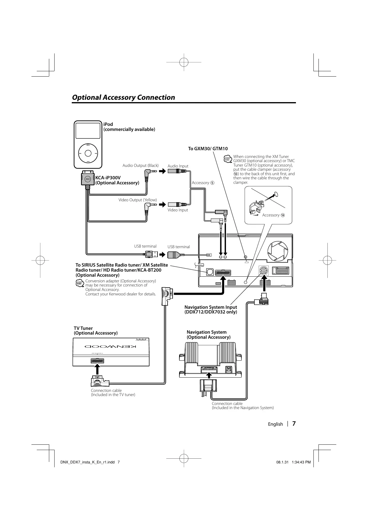 Optional Accessory Connection iPod (commercially available) To GXM30/ GTM10 Audio Output (Black) Audio Input KCA-iP300V (Optional Accessory) Accessory 5 When connecting the XM Tuner GXM30 (optional accessory) or TMC Tuner GTM10 (optional accessory), put the cable clamper (accessory $) to the back of this unit first, and then wire the cable through the clamper. Video Output (Yellow) Video Input Accessory $ USB terminal USB terminal To SIRIUS Satellite Radio tuner/ XM Satellite Radio tuner/ HD Radio tuner/KCA-BT200 (Optional Accessory) Conversion adapter (Optional Accessory) may be necessary for connection of Optional Accessory. Contact your Kenwood dealer for details. Navigation System Input (DDX712/DDX7032 only) TV Tuner (Optional Accessory) Navigation System (Optional Accessory)