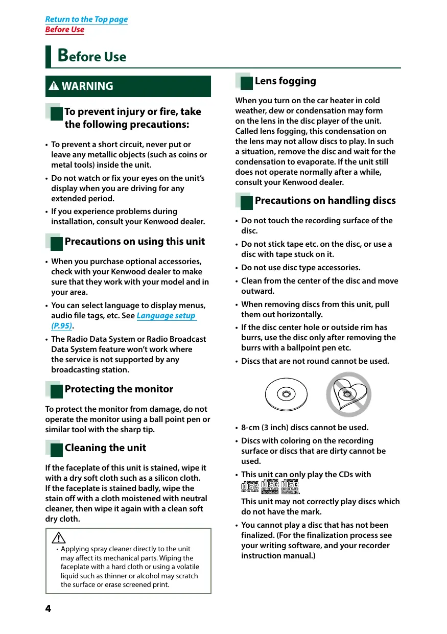 Return to the Top page Before Use I Before Use To prevent injury or fire, take the following precautions: + To prevent a short circuit, never put or leave any metallic objects (such as coins or metal tools) inside the unit. + Do not watch or fix your eyes on the units display when you are driving for any extended period. + If you experience problems during installation, consult your Kenwood dealer. E Precautions on using this uni: + When you purchase optional accessories, check with your Kenwood dealer to make sure that they work with your model and in your area. + You can select language to display menus, audio file tags, etc. See Language setup (P.95). + The Radio Data System or Radio Broadcast Data System feature won't work where the service is not supported by any broadcasting station. E Protecting the monitor To protect the monitor from damage, do not operate the monitor using a ball point pen or similar tool with the sharp tip. Bcteaning the unit Ifthe faceplate of this unit is stained, wipe it with a dry soft cloth such as a silicon cloth. Ifthe faceplate is stained badly, wipe the stain off with a cloth moistened with neutral cleaner, then wipe it again with a clean soft dry cloth.