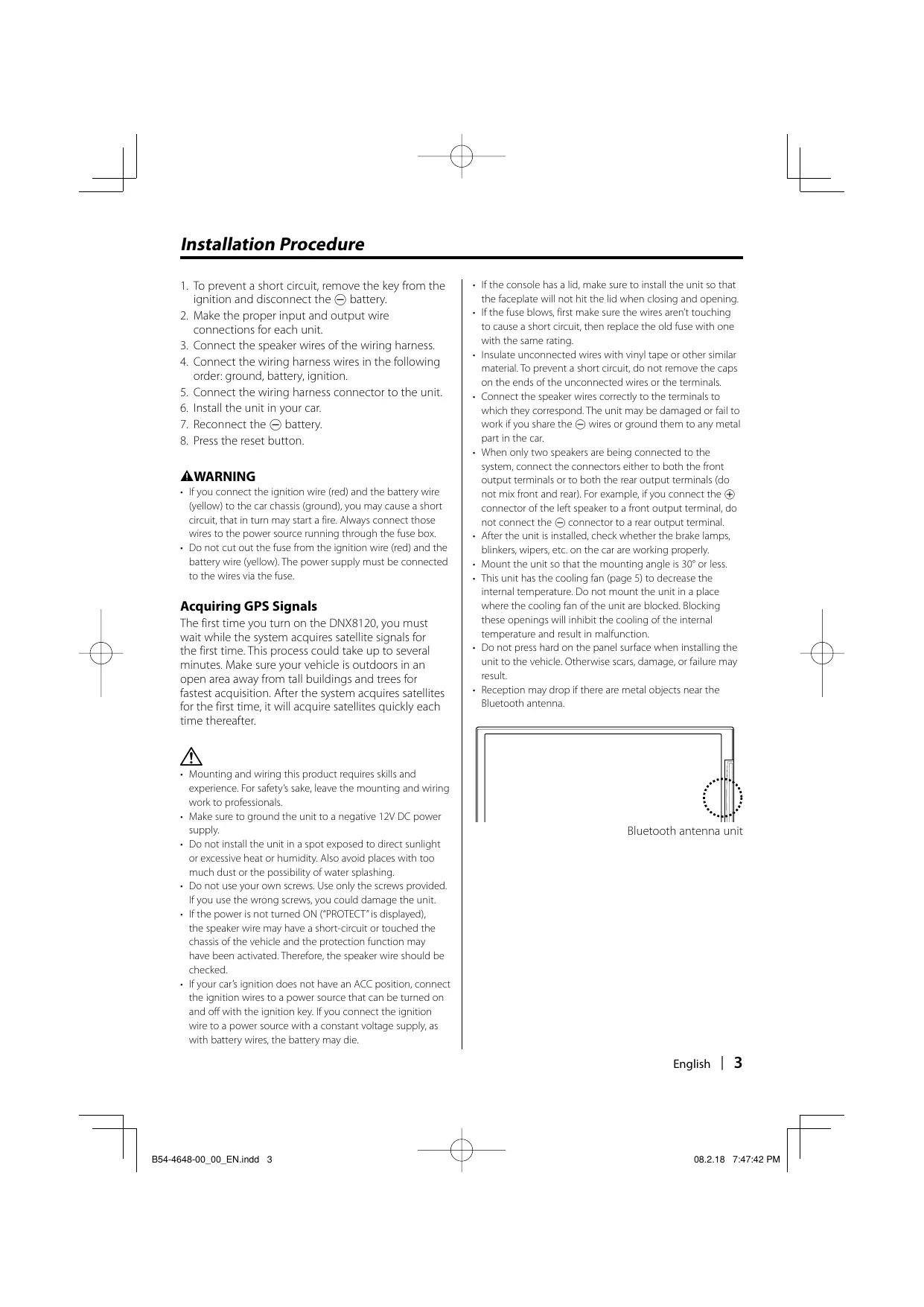 08.2.18 7:47:40 PM Installation Procedure 1. To prevent a short circuit, remove the key from the ignition and disconnect the - battery. 2. Make the proper input and output wire connections for each unit. 3. Connect the speaker wires of the wiring harness. 4. Connect the wiring harness wires in the following order: ground, battery, ignition. 5. Connect the wiring harness connector to the unit. 6. Install the unit in your car. 7. Reconnect the - battery. 8. Press the reset button.