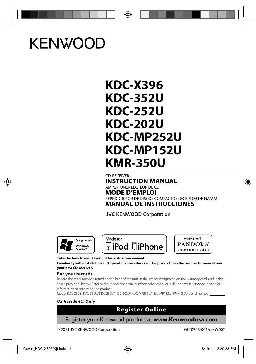Take the time to read through this instruction manual. Familiarity with installation and operation procedures will help you obtain the best performance from your new CD-receiver. For your records Record the serial number, found on the back of the unit, in the spaces designated on the warranty card, and in the space provided below. Refer to the model and serial numbers whenever you call upon your Kenwood dealer for information or service on the product. Model KDC-X396/ KDC-352U/ KDC-252U/ KDC-202U/ KDC-MP252U/ KDC-MP152U/ KMR-350U Serial number US Residents Only Register Online Register your Kenwood product at www.Kenwoodusa.com © 2011 JVC KENWOOD Corporation Cover_KDC-X396[K]f.indd 1 GET0743-001A (KW/K0) 8/19/11 2:20:23 PM CONTENTS Safety