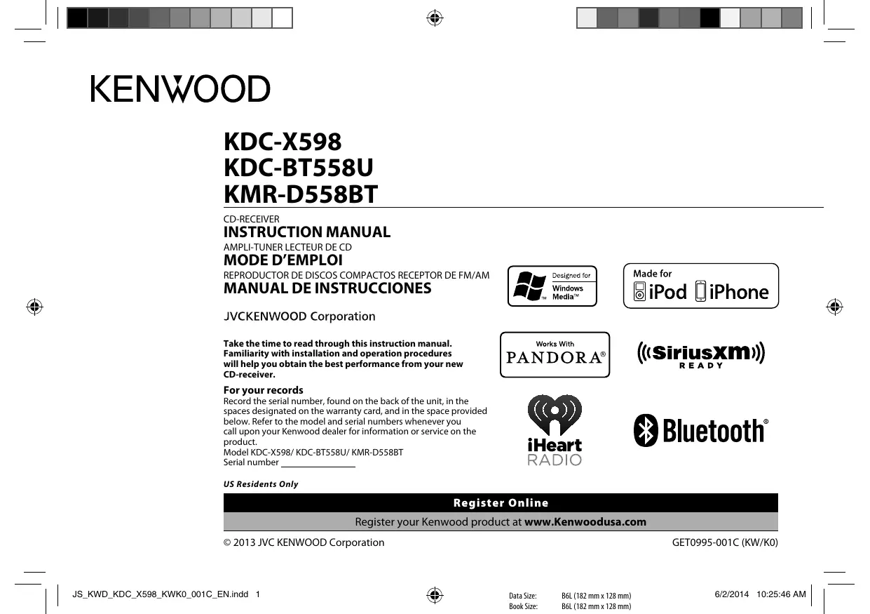 Take the time to read through this instruction manual. Familiarity with installation and operation procedures will help you obtain the best performance from your new CD-receiver. For your records Record the serial number, found on the back of the unit, in the spaces designated on the warranty card, and in the space provided below. Refer to the model and serial numbers whenever you call upon your Kenwood dealer for information or service on the product. Model KDC-X598/ KDC-BT558U/ KMR-D558BT Serial number US Residents Only Register Online Register your Kenwood product at www.Kenwoodusa.com © 2013 JVC KENWOOD Corporation Data Size: Book Size: Warning Do not operate any function that takes your attention away from safe driving. Caution Volume setting: