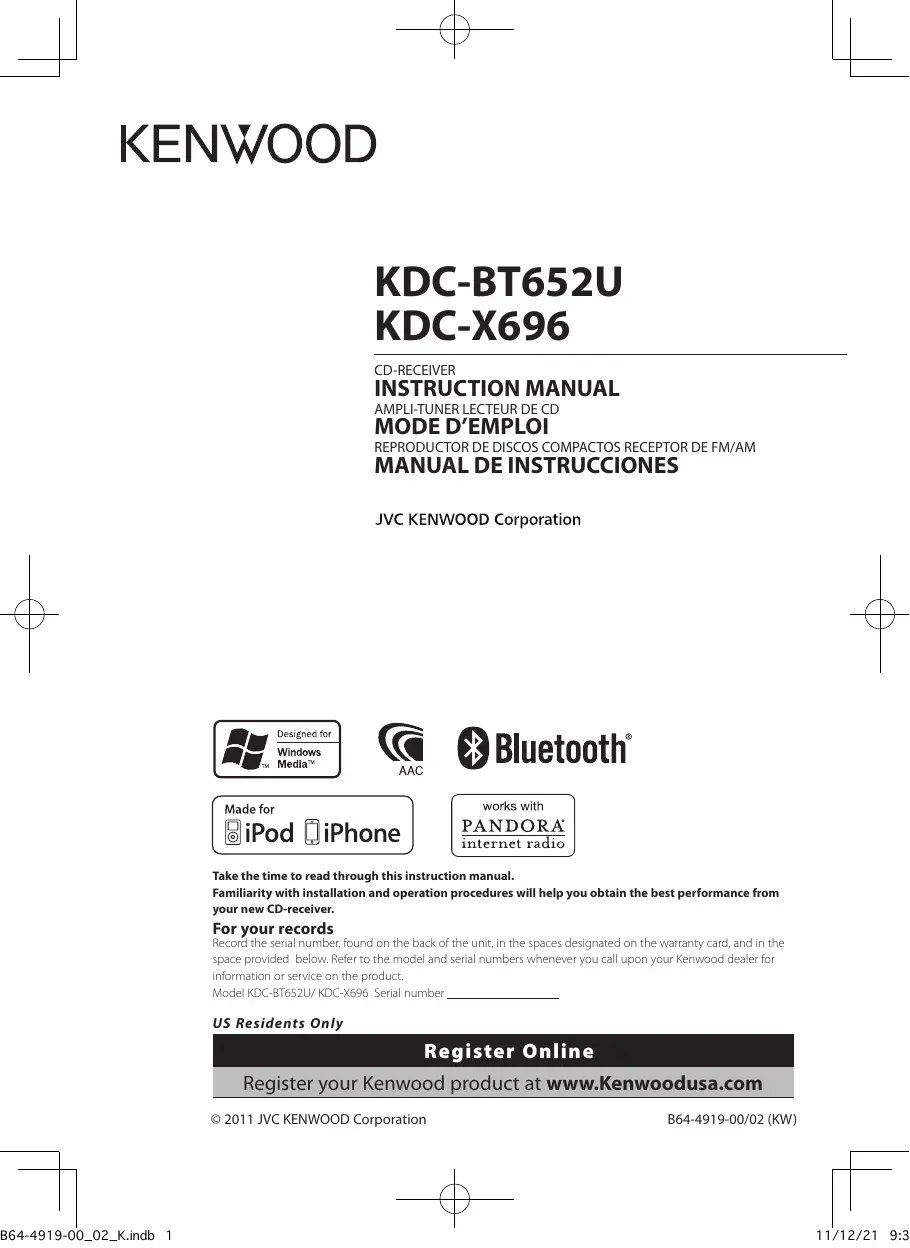 Made for works with : iPod [iPhone PANDORA Take the time to read through this instruction manual. US Residents Only Register Onl Register your Kenwood product at www.Kenwoodusa.com 864-4919-00/02 (KW) © 2011 JVC KENWOOD Corporation