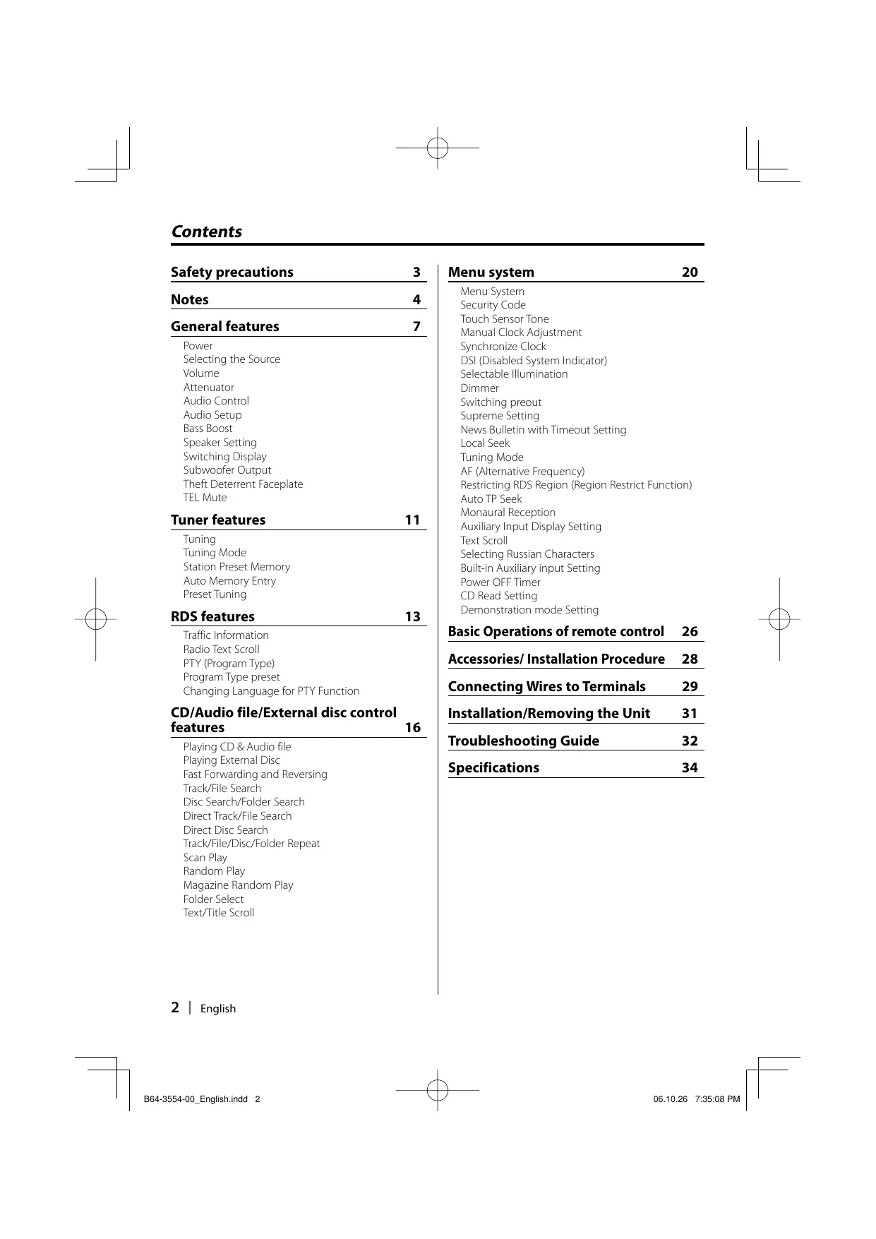 B64-3554-00_Englishindd 2 Contents Safety precautions 3 Menu system 20 Menu System Notes 4 Security Code Touch Sensor Tone General features 7 Manual Clock Adjustment Power Synchronize Clock Selecting the Source DS (Disabled System Indicator) Volume Selectable Illumination Attenuator Dimmer Audio Control Switching preout Audio Setup Supreme Setting Bass Boost News Bulletin with Timeout Setting Speaker Setting Switching Display Subwoofer Output Theft Deterrent Faceplate TEL Mute Tuner features 11 Tuning Tuning Mode Station Preset Memory Auto Memory Entry Preset Tuning RDS features 13 Traffic Information Radio Text Scrol PTY (Program Type) Program Type preset Changing Language for PTY Function CD/Audio file/External disc control features 16 Playing CD & Audio file Playing External Disc Fast Forwarding and Reversing Track/File Search Disc Search/Folder Search Direct Track/File Search Direct Disc Search Track/File/Disc/Folder Repeat Scan Play Random Play Magazine Random Play Folder Select Text/Title Scroll 2 | English Local Seek Tuning Mode AF (Alternative Frequency) Restricting RDS Region (Region Restrict Function) Auto TP Seek Monaural Reception Auxiliary Input Display Setting Text Scroll Selecting Russian Characters Built-in Auxiliary input Setting Power OFF Timer CD Read Setting Demonstration mode Setting Basic Operations of remote control 26 Accessories/ Installation Procedure 28 Connecting Wires to Terminals 29 Installation/Removing the Unit 31 Troubleshooting Guide 32 Specifications 34