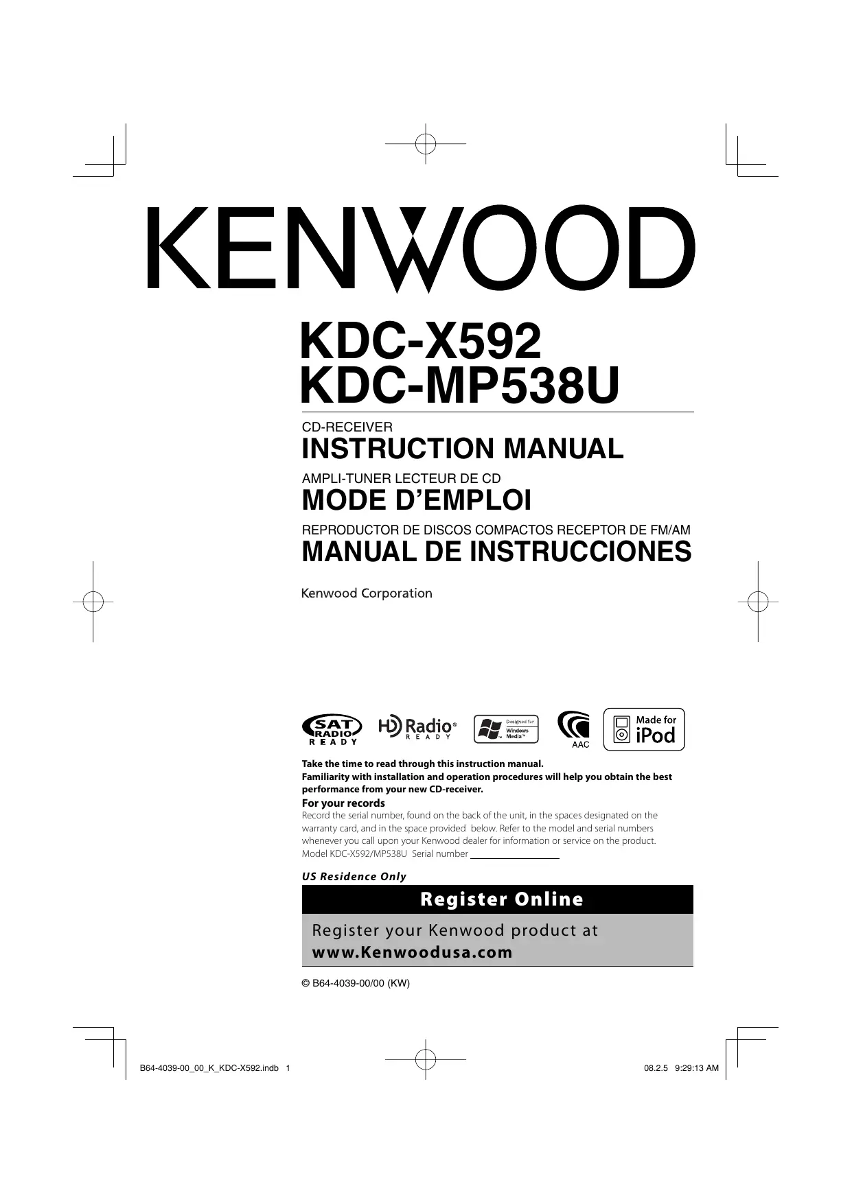 Take the time to read through this instruction manual. Familiarity with installation and operation procedures will help you obtain the best performance from your new CD-receiver. For your records Record the serial number, found on the back of the unit, in the spaces designated on the warranty card, and in the space provided below. Refer to the model and serial numbers whenever you call upon your Kenwood dealer for information or service on the product. Model KDC-X592/MP538U Serial number US Residence Only Register Online Register your Kenwood product at www.Kenwoodusa.com © B64-4039-00/00 (KW) B64-4039-00̲00̲K̲KDC-X592.indb 1