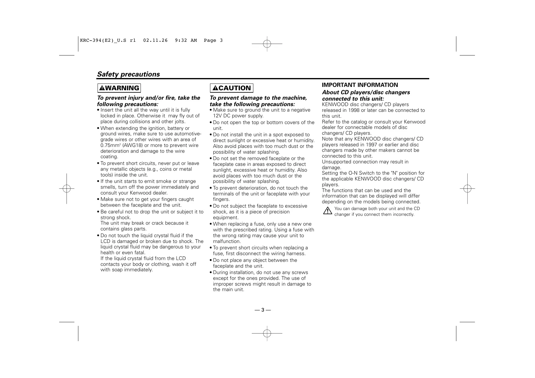 Safety precautions KRC-394(E2) U.S rl 02.11.26 9:32 AM Page 3 À To prevent injury and/or fire, take the following precautions: + Insert the unit all the way until it is fully locked in place. Otherwise it may fly out of place during collisions and other jolts. + When extending the ignition, battery or ground wires, make sure to use automotive- grade wires or other wires with an area of 0.75mm (AWG18) or more to prevent wire deterioration and damage to the wire coating + To prevent short circuits, never put or leave any metallic objects (e.g., coins or metal tools) inside the unit. + If the unit starts to emit smoke or strange smells, turn off the power immediately and consult your Kenwood dealer. + Make sure not to get your fingers caught between the faceplate and the unit. + Be careful not to drop the unit or subject it to strong shock. The unit may break or crack because it contains glass parts. + Do not touch the liquid crystal fluid if the LCD is damaged or broken due to shock. The liquid crystal fluid may be dangerous to your health or even fatal If the liquid crystal fluid from the LCD contacts your body or clothing, wash it off with soap immediately. ACAUTION To prevent damage to the machine, take the following precautions: + Make sure to ground the unit to a negative 12V DC power supply. + Do not open the top or bottom covers of the unit + Do not install the unit in a spot exposed to direct sunlight or excessive heat or humidity. Also avoid places with too much dust or the possibility of water splashing. + Do not set the removed faceplate or the faceplate case in areas exposed to direct sunlight, excessive heat or humidity. Also avoid places with too much dust or the possibility of water splashing. + To prevent deterioration, do not touch the terminals of the unit or faceplate with your fingers. + Do not subject the faceplate to excessive shock, as it is a piece of precision equipment. e When replacing a fuse, only use a new one with the prescribed rating. Using a fuse with the wrong rating may cause your unit to malfunction. « To prevent short circuits when replacing a fuse, first disconnect the wiring harness + Do not place any object between the faceplate and the unit. « During installation, do not use any screws except for the ones provided. The use of improper screws might result in damage to the main unit IMPORTANT INFORMATION About CD players/disc changers connected to this unit: KENWOOD disc changers/ CD players released in 1998 or later can be connected to this unit Refer to the catalog or consult your Kenwood dealer for connectable models of disc changers/ CD players Note that any KENWOOD disc changers/ CD players released in 1997 or earlier and disc changers made by other makers cannot be connected to this unit Unsupported connection may result in damage Setting the O-N Switch to the "N' position for the applicable KENWOOD disc changers/ CD players. The functions that can be used and the information that can be displayed will differ depending on the models being connected. You can damage both your unit and the CD changer if you connect them incorrectiy.