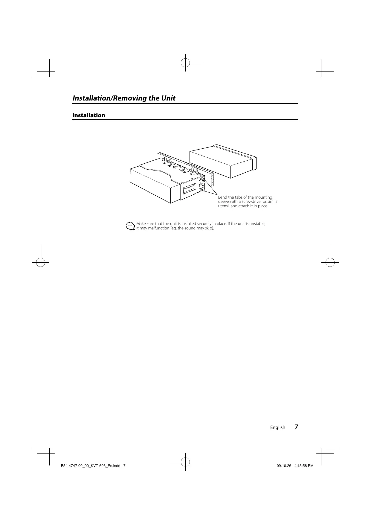 Make sure that the unit is installed securely in place. If the unit is unstable, it may malfunction (eg, the sound may skip).