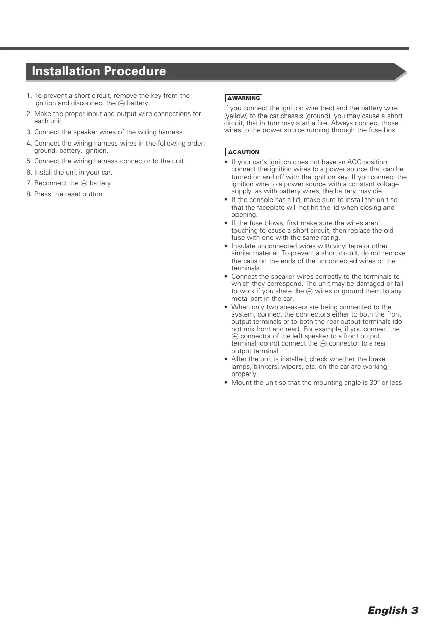 - Mount the unit so that the mounting angle is 30° or less. English 3 Connection 2WARNING English If you connect the ignition wire (red) and the battery wire (yellow) to the car chassis (ground), you may cause a short circuit, that in turn may start a fire. Always connect those wires to the power source running through the fuse box. Monitor unit Do not connect. Wiring harness (Accessory 3) Connect to the vehicle's parking brake detection switch harness using the supplied relay connector. 2 CAUTION For the sake of safety, be sure to connect the parking sensor. PRK SW