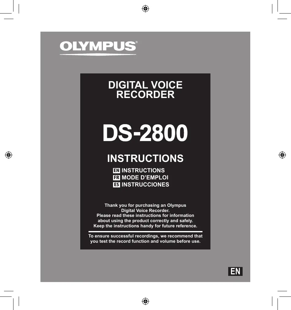 OLYMPUS DIGITAL VOICE RECORDER DS-2800 INSTRUCTIONS EI INSTRUCTIONS Li MODE D'EMPLOI HE INSTRUCCIONES Thank you for purchasing an Olympus Digital Voice Recorder. Please read these instructions for information about using the product correctly and safely. Keep the instructions handy for future reference. To ensure successful recordings, we recommend that you test the record function and volume before use.