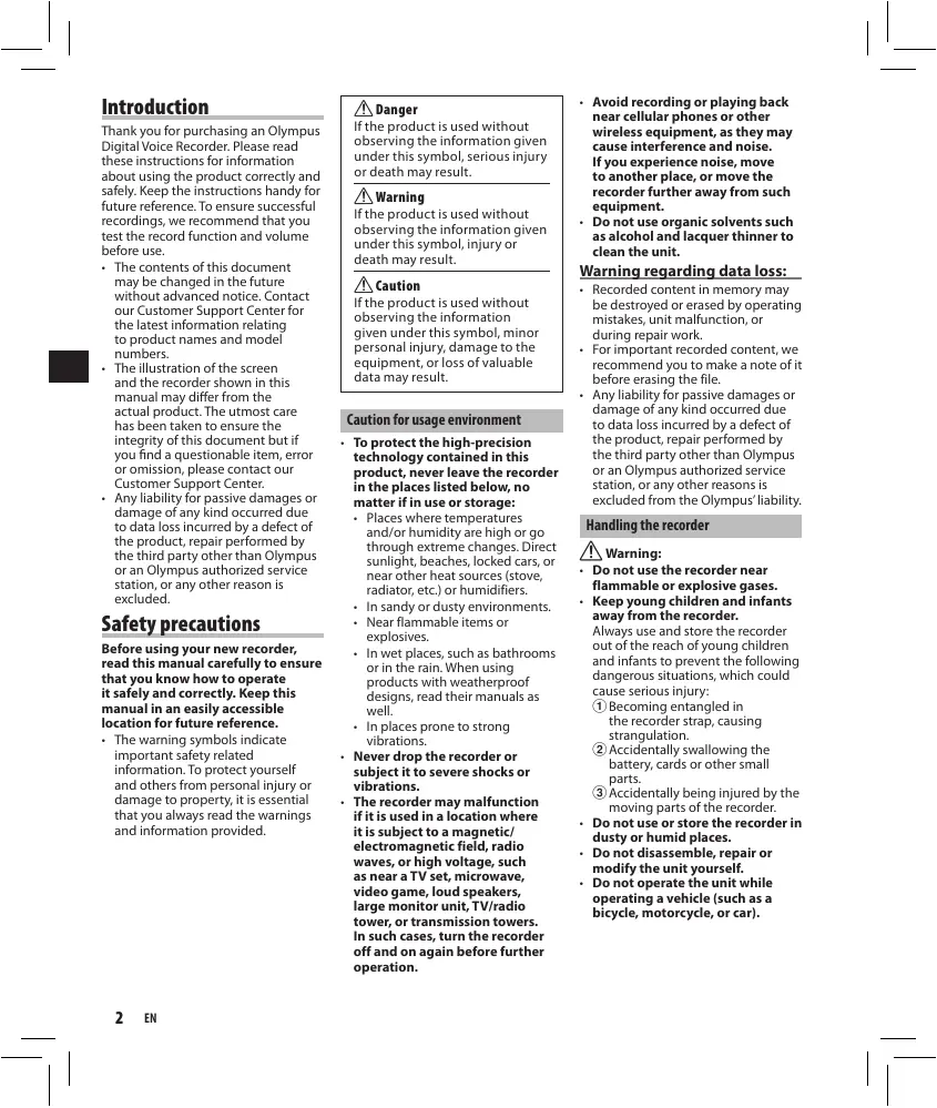 Never attempt to disassemble a battery or modify it in any way, solder, etc. • If a battery fluid gets into your eyes, flush your eyes immediately with clear, cold running water and seek medical attention immediately. f Warning: • Keep batteries dry at all times. • Do not use a battery if it is cracked or broken. • Never subject batteries to strong shocks or continuous vibration. • If a battery leaks, becomes discolored or deformed, or becomes abnormal in any other way during operation, stop using the recorder. • If a battery leaks fluid onto your clothing or skin, remove the clothing and flush the affected area with clean, running cold water immediately. If the fluid burns your skin, seek medical attention immediately. • Keep battery out of the reach of children. • If you notice anything unusual when using this product such as abnormal noise, heat, smoke, or a burning odor: 1 remove the battery immediately while being careful not to burn yourself, and; 2 call your dealer or local Olympus representative for service. f Caution: • Please recycle batteries to help save our planet’s resources. When you throw away dead batteries, be sure to cover their terminals and always observe local laws and regulations.