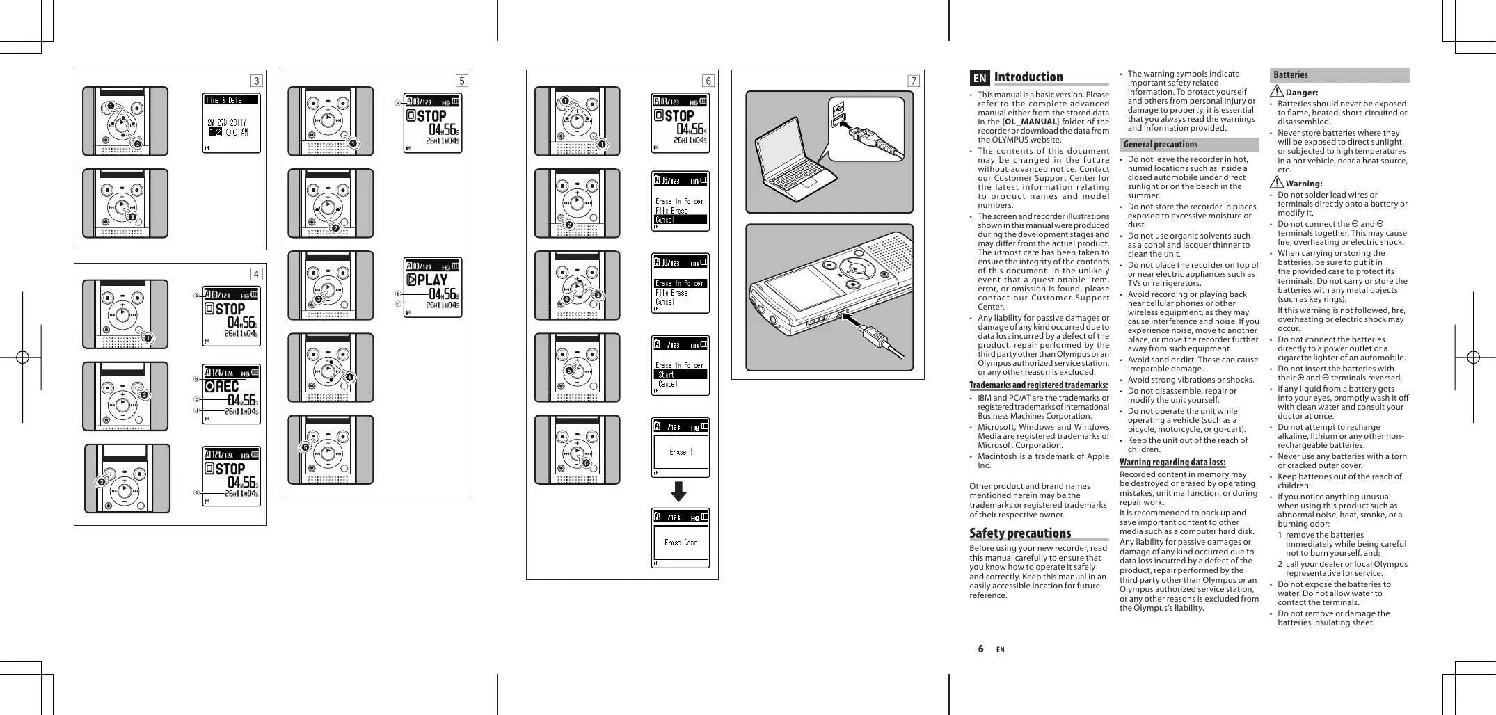 8 kHz, 11 kHz, 16 kHz, 22 kHz, 32 kHz, 44,1 kHz, 48 kHz • Le contenu de ce document peut être modifié par la suite sans préavis. Veuillez contacter notre centre de service après-vente pour obtenir les dernières informations concernant les noms de produits et les numéros de modèles. • Le plus grand soin a été pris afin d’assurer l’intégrité du contenu de ce document. Dans le cas peu probable où vous auriez un doute ou si vous trouvez une erreur ou une omission,veuillez contacter notre centre de service après-vente. • Toute responsabilité pour dommages passifs ou dommages de quelque nature que ce soit survenus à cause d’une perte de données causée par un défaut du produit, réparation effectuée par un tiers autre que Olympus ou un service agréé par Olympus, ou toute autre raison est exclue.