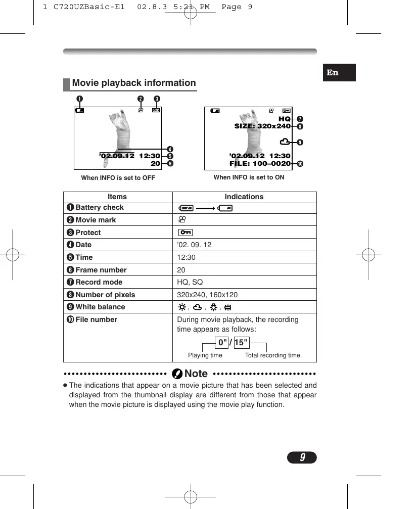 ’02.09.12 12:30 FILE: 100–0020 When INFO is set to ON When INFO is set to OFF Items 1 Battery check 2 Movie mark 3 Protect 4 Date 5 Time 6 Frame number 7 Record mode 8 Number of pixels 9 White balance 0 File number Indications During movie playback, the recording time appears as follows: 0" / 15" Playing time Total recording time Note ● The indications that appear on a movie picture that has been selected and displayed from the thumbnail display are different from those that appear when the movie picture is displayed using the movie play function.