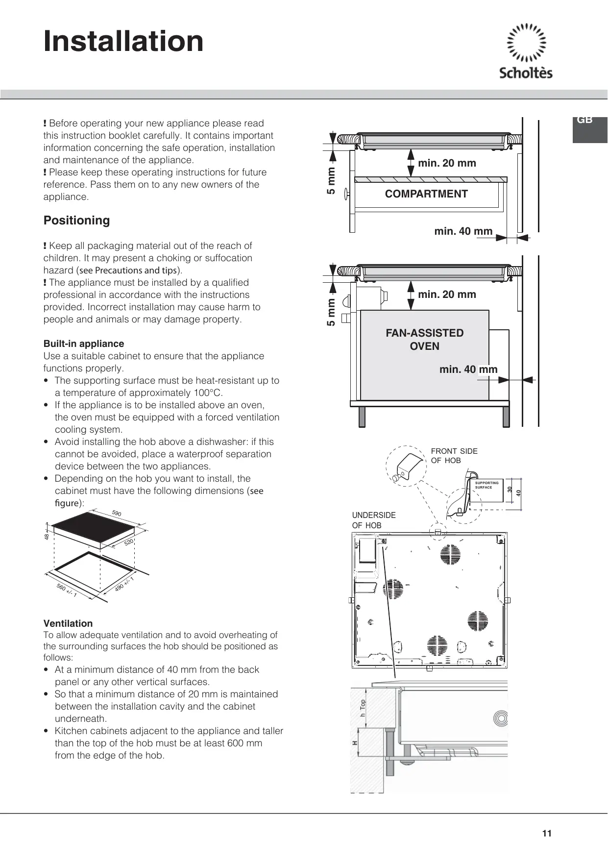GB English Operating Instructions HOB Contents Operating Instructions,1 WARNING,2 Description of the appliance-Control Panel,6 Installation,11 Start-up and use,13 Precautions and tips,17 Care and maintenance,18 Technical description of the models,18