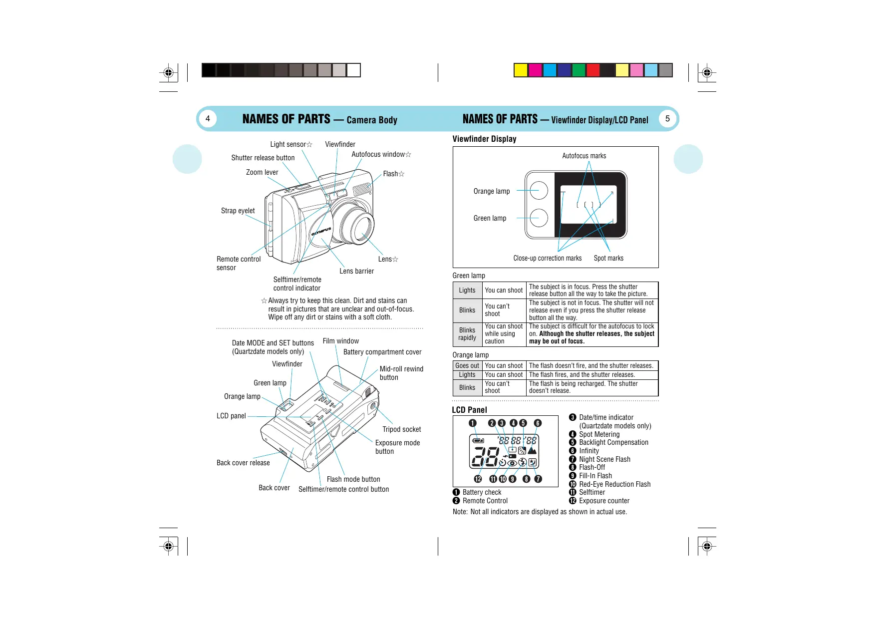 Viewfinder: Real image zoom viewfinder [with autofocus marks, close-up correction marks, green lamp (autofocus indicator) and orange lamp (flash indicator)].