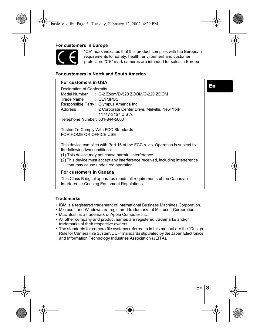Model Number : C-2 Zoom/D-520 ZOOM/C-220 ZOOM Trade Name : OLYMPUS Responsible Party : Olympus America Inc. Address : 2 Corporate Center Drive, Melville, New York 11747-3157 U.S.A. Telephone Number: 631-844-5000 Tested To Comply With FCC Standards FOR HOME OR OFFICE USE This device complies with Part 15 of the FCC rules. Operation is subject to the following two conditions: (1) This device may not cause harmful interference. (2) This device must accept any interference received, including interference that may cause undesired operation.