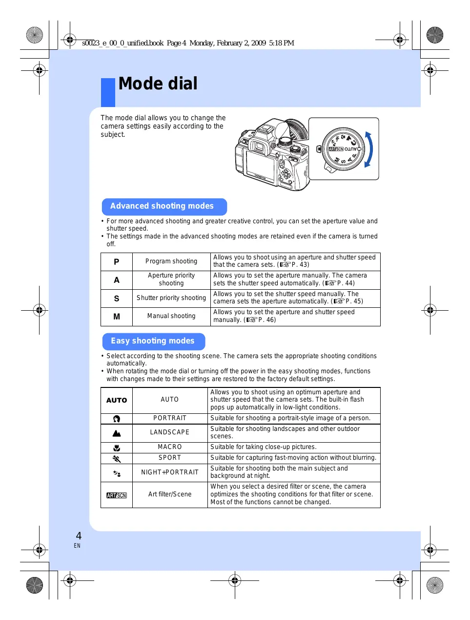 | dr æ||® @ 3 e 00 0 urifiodhook Page 4 Monday, February 2, 2009 5:18 PM SA || Mode dial The mode dial allows you to change the camera settings easily according to the subject. Advanced shooting modes + For more advanced shooting and greater creative control, you can setthe aperture value and shutter speed. + The settings made in the advanced shooting modes are retained even ifthe camera is turmed off. Allows you to shootusing an aperture and shuter speed Program shooËing |ihatthe camera sets. (ESP. 43) Aperure prorty— [Alows you to setthe apenure manual. The camera shooting sets the shutter speed automatically. (EP. 44) Allows you to set the shutfer speed manually. The camera sets the aperture automatically. (ESP. 45) Allows you to setthe aperture and shutter speed manually. (LP. 46) Shutter priority shooting zlo|»>| Manual shooting Easy shooting modes + Select according to the shooting scene. The camera sets the appropriate shooting conditions automatically. + When rotating the mode dial or turning off the power in the easy shooting modes, functions with changes made to their settings are restored to the factory default settings.