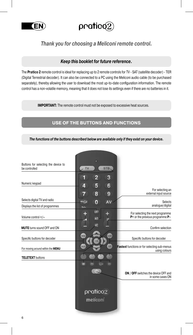 Thank you for choosing a Meliconi remote control. Keep this booklet for future reference. The Pratico 2 remote control is ideal for replacing up to 2 remote controls for TV - SAT (satellite decoder) - TER (Digital Terrestrial decoder). It can also be connected to a PC using the Meliconi audio cable (to be purchased separately), thereby allowing the user to download the most up-to-date configuration information. The remote control has a non-volatile memory, meaning that it does not lose its settings even if there are no batteries in it. IMPORTANT: The remote control must not be exposed to excessive heat sources.