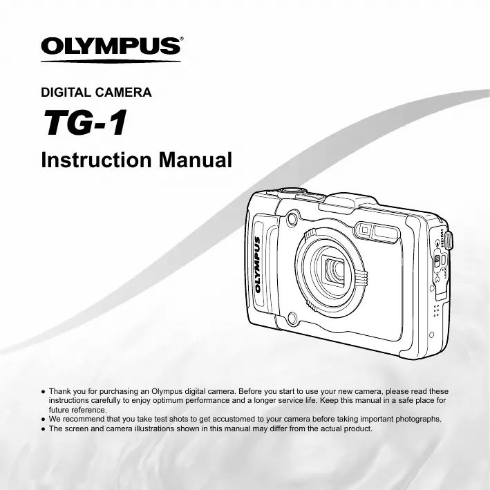 OLYMPUS DIGITAL CAMERA TG-1 Instruction Manual + Thank you for purchasing an Olympus digital camera. Before you start o use your new camera, please read these instructions carefull to enjoy optimum performance and a longer service life. Keep this manual in a safe place for future reference. We recommend that you take test shots to get accustomed to your camera before taking important phatographs. The screen and camera ilustrations shown in this manual may diffr from the actual product.