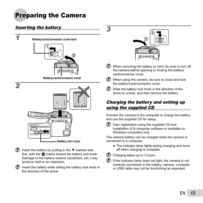 Preparing the Camera Inserting the battery À sanorearonnecor cover ok TE ock knob @ isa tnebatery by putingin the V marked side first, with the @ marks toward the battery lock knob. Damage tot bay exeior (suralchs, el) May produce heal or an explosion @ ser te battery wie sing he battery lock Anob in ie iection of he aron. @ vien remoung the bat or card, be sure 1 tu of ne camera before vpeniny or sing ie Battery! cardlcomnector cover. @ vien using ie camera, be sure to dose and lock ie baie cardconnecor cave. @ Sice ie batry lock knob in ne direction of the arrou unlock and ton remove the ation, Charging the battery and setting up using the supplied CD ‘Connect he camera a the computer to charge the battery and use the supplied GD for setup @ User registration using the supplied CD and installation ob computer sofare is available on Windous computers on. ‘The camera battery can be éharged ile he camera is connected to a computer. The indicator lamp lights during eharging and tums aff when charging is complete @ Charging takes up to 3 hours @) ifine idicator lamp does not light, he camera is not correcly connected or he battery, camera, computer, or USB cable may not be functoning as expected