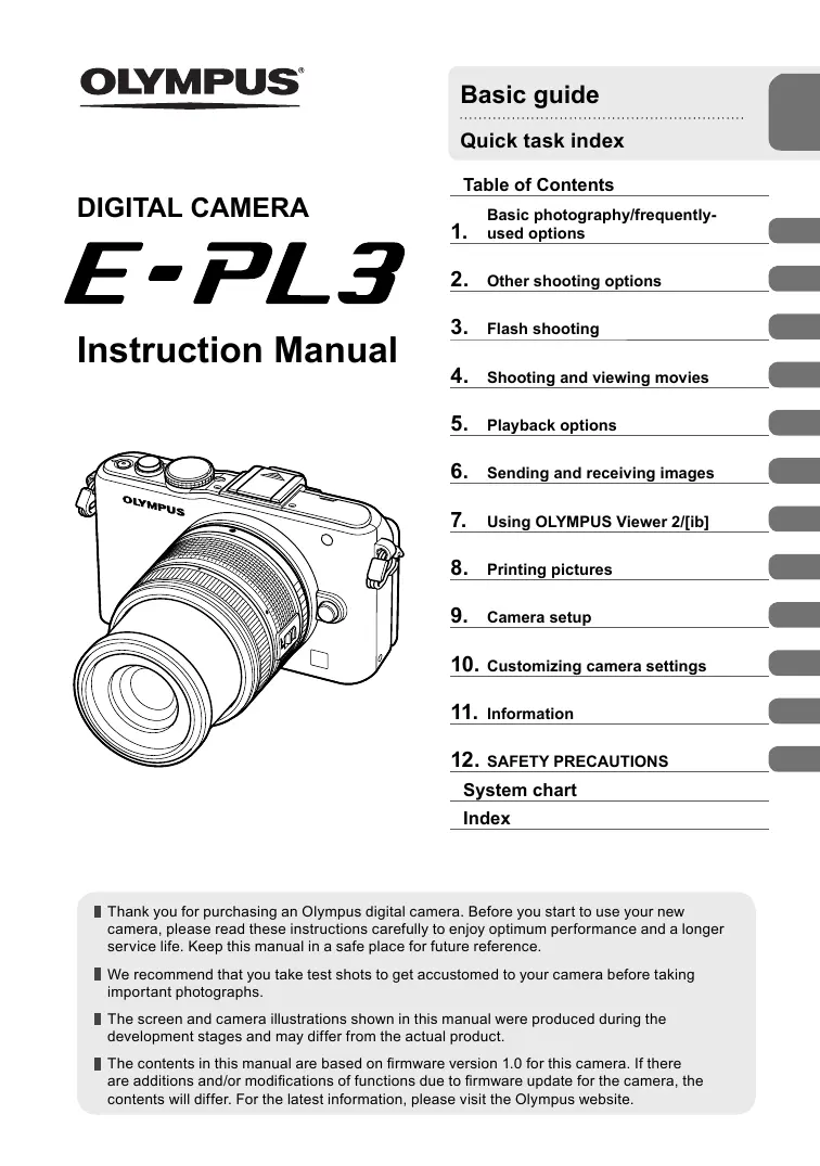 Download the instructions for your Appareil photo numérique in PDF format for free! Find your manual E-PL3 - OLYMPUS and take your electronic device back in hand. On this page are published all the documents necessary for the use of your device. E-PL3 by OLYMPUS.