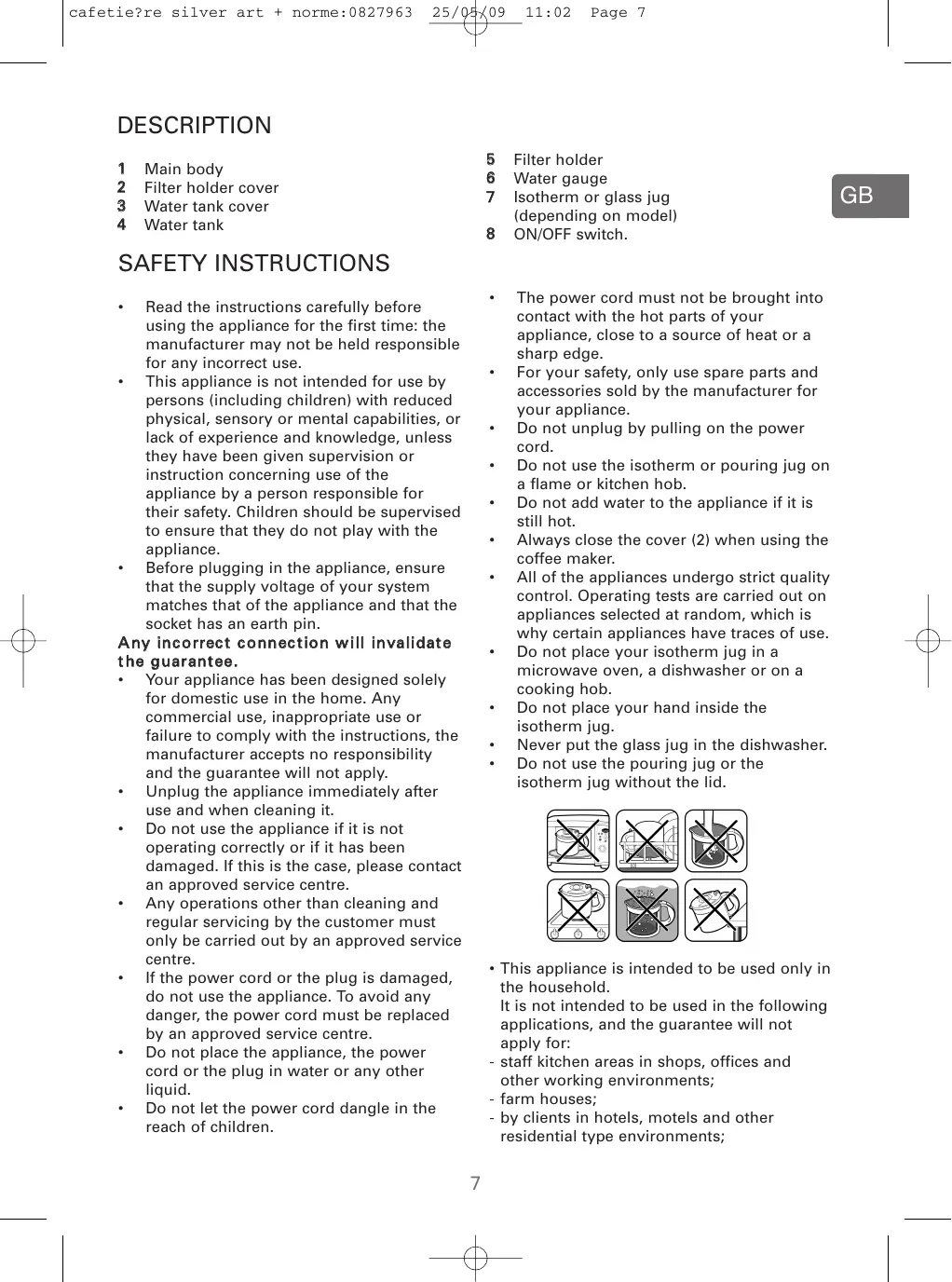 For your safety, only use spare parts and accessories sold by the manufacturer for your appliance. Do not unplug by pulling on the power cord. Do not use the isotherm or pouring jug on a flame or kitchen hob. Do not add water to the appliance if it is still hot. Always close the cover (2) when using the coffee maker. All of the appliances undergo strict quality control. Operating tests are carried out on appliances selected at random, which is why certain appliances have traces of use. Do not place your isotherm jug in a microwave oven, a dishwasher or on a cooking hob. Do not place your hand inside the isotherm jug. Never put the glass jug in the dishwasher. Do not use the pouring jug or the isotherm jug without the lid.