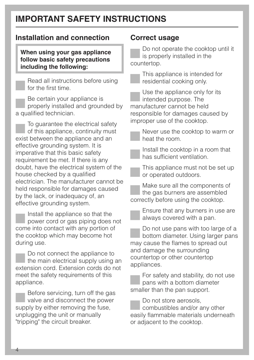 Use the appliance only for its intended purpose. The manufacturer cannot be held responsible for damages caused by improper use of the cooktop.