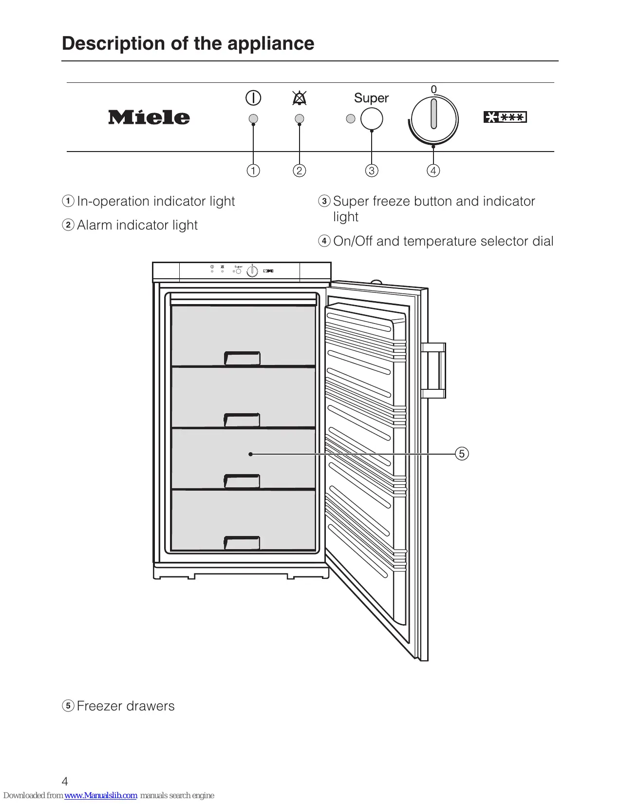 Downloaded from www.Manualslib.com manuals search engine ^ The Super freeze function has not been switched off. The indicator light is still on. . . . the appliance is switching in too frequently and for too long. ^ Check whether the ventilation gaps have been covered over or become too dusty. ^ Check whether the metal grille (heat exchanger) at the rear of the appliance has become too dusty. ^ The door has been opened too frequently, or a large amount of fresh food has been put in at once for freezing. ^ Check that the door has been properly closed. ^ Check whether a thick layer of ice has built up. If it has, then the freezer will need defrosting. . . . the alarm indicator light is on. The temperature has risen above the setting on the temperature dial because ^ the door has been opened too frequently, or large amounts of fresh food have been put in at once for freezing. ^ there has been a lengthy interruption to the power supply. ^ the ventilation gaps are blocked. Once the problem has been resolved the alarm indicator light will go out. Problem solving guide . . . . . . the Super freeze indicator light does not light up although the appliance is working. ^ The indicator light is defective. Call the Service Department. . . . food has frozen together. Use a blunt instrument, e.g. a spoon handle or plastic scraper, to prise it apart carefully. . . . there is a thick layer of ice in the freezer. ^ Check whether the door closes properly. ^ Defrost and then clean the freezer. Too thick a layer of ice reduces efficiency and increases energy consumption. If you still cannot remedy the fault having followed these suggestions, please contact the Miele Service Department. To prevent unecessary loss of temperature it is advisable not to open the door while waiting for the appliance to be serviced.