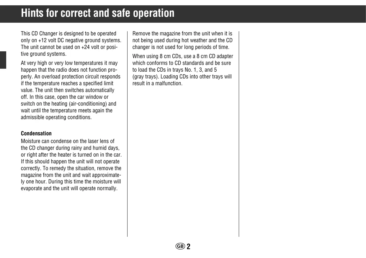 Hints for correct and safe operation This CD Changer is designed to be operated only on +12 volt DC negative ground systems. The unit cannot be used on +24 volt or positive ground systems. At very high or very low temperatures it may happen that the radio does not function properly. An overload protection circuit responds if the temperature reaches a specified limit value. The unit then switches automatically off. In this case, open the car window or switch on the heating (air-conditioning) and wait until the temperature meets again the admissible operating conditions.