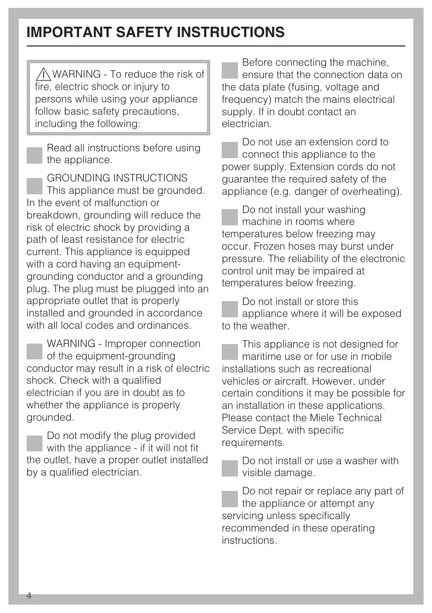 IMPORTANT SAFETY INSTRUCTIONS Faulty components must only be replaced with genuine Miele spare parts.