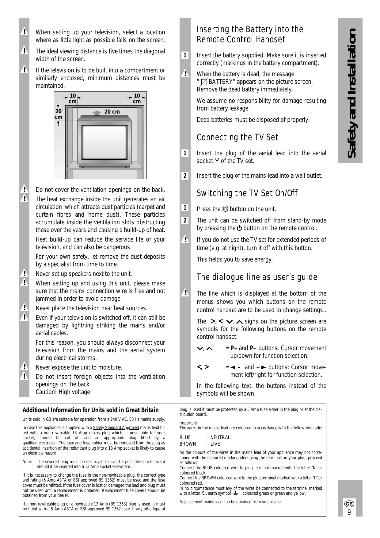 Do not cover the ventilation openings on the back. The heat exchange inside the unit generates an air circulation which attracts dust particles (carpet and curtain fibres and home dust). These particles accumulate inside the ventilation slots obstructing these over the years and causing a build-up of heat. Heat build-up can reduce the service life of your television, and can also be dangerous. For your own safety, let remove the dust deposits by a specialist from time to time. Never set up speakers next to the unit. When setting up and using this unit, please make sure that the mains connection wire is free and not jammed in order to avoid damage. Never place the television near heat sources. Even if your television is switched off, it can still be damaged by lightning striking the mains and/or aerial cables. For this reason, you should always disconnect your television from the mains and the aerial system during electrical storms. Never expose the unit to moisture. Do not insert foreign objects into the ventilation openings on the back. Caution! High voltage!