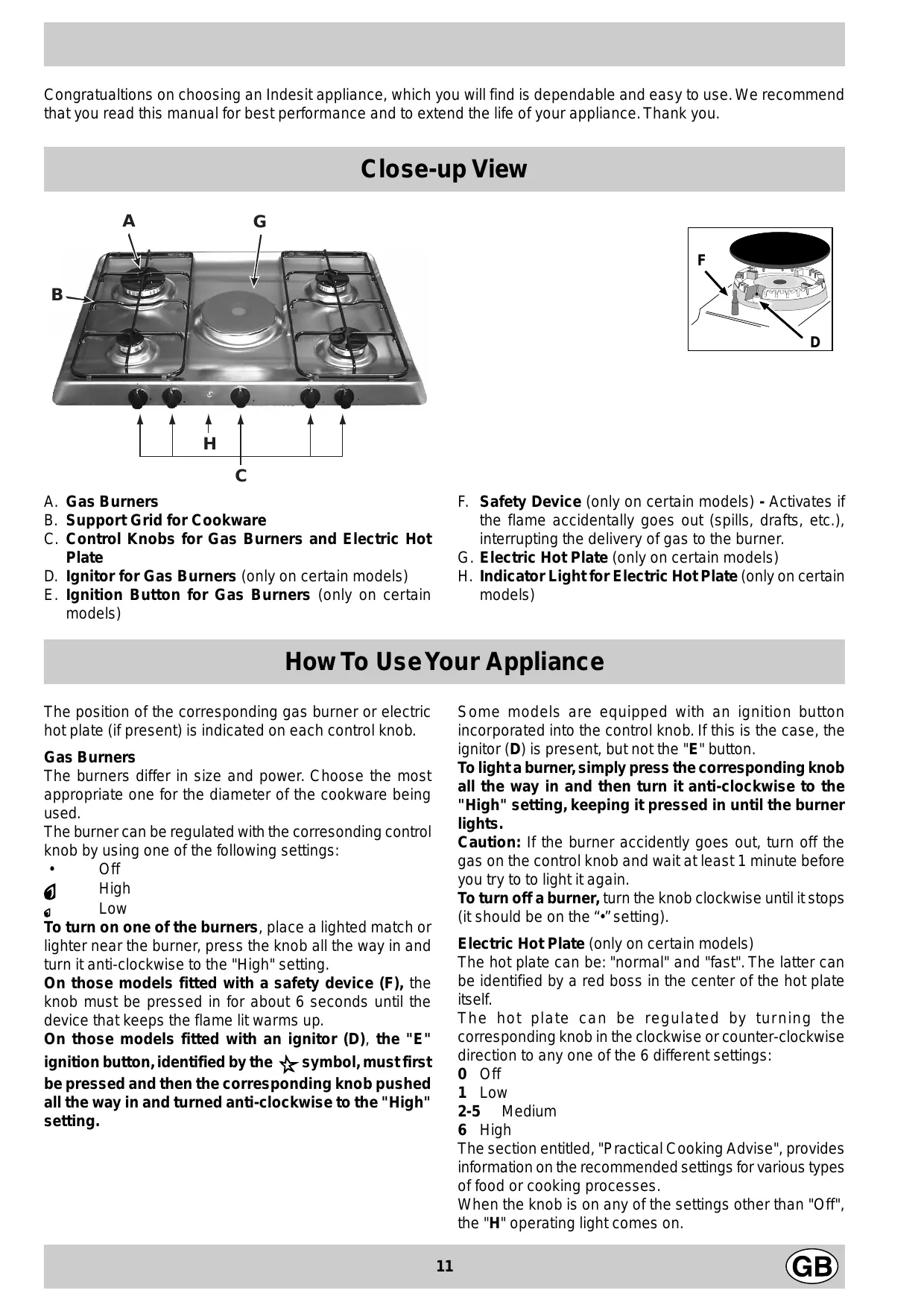 A G F B D H C A. Gas Burners B. Support Grid for Cookware C. Control Knobs for Gas Burners and Electric Hot Plate D. Ignitor for Gas Burners (only on certain models) E. Ignition Button for Gas Burners (only on certain models)