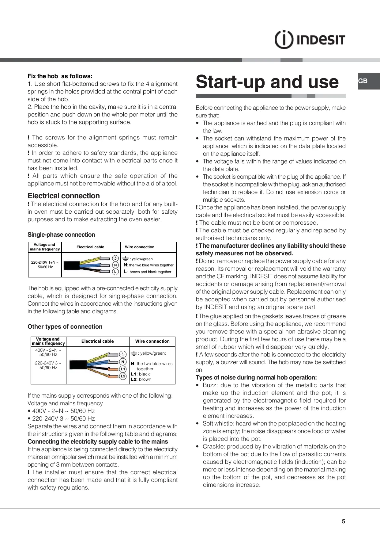 - The socket is compatible with the plug of the appliance. If the socket is incompatible with the plug, ask an authorised technician to replace it. Do not use extension cords or multiple sockets. ! Once the appliance has been installed, the power supply cable and the electrical socket must be easily accessible. ! The cable must not be bent or compressed. ! The cable must be checked regularly and replaced by authorised technicians only. ! The manufacturer declines any liability should these safety measures not be observed. ! Do not remove or replace the power supply cable for any reason. Its removal or replacement will void the warranty and the CE marking. INDESIT does not assume liability for accidents or damage arising from replacement/removal of the original power supply cable. Replacement can only be accepted when carried out by personnel authorised by INDESIT and using an original spare part. ! The glue applied on the gaskets leaves traces of grease on the glass. Before using the appliance, we recommend you remove these with a special non-abrasive cleaning product. During the first few hours of use there may be a smell of rubber which will disappear very quickly. ! A few seconds after the hob is connected to the electricity supply, a buzzer will sound. The hob may now be switched on. Types of noise during normal hob operation: