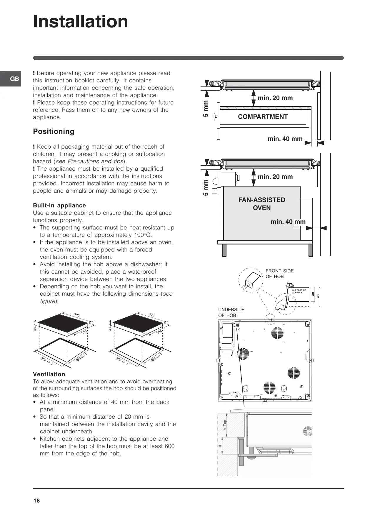 • de manière à ce qu’il reste au moins 20 mm de distance entre la découpe d’encastrement et le meuble en dessous.