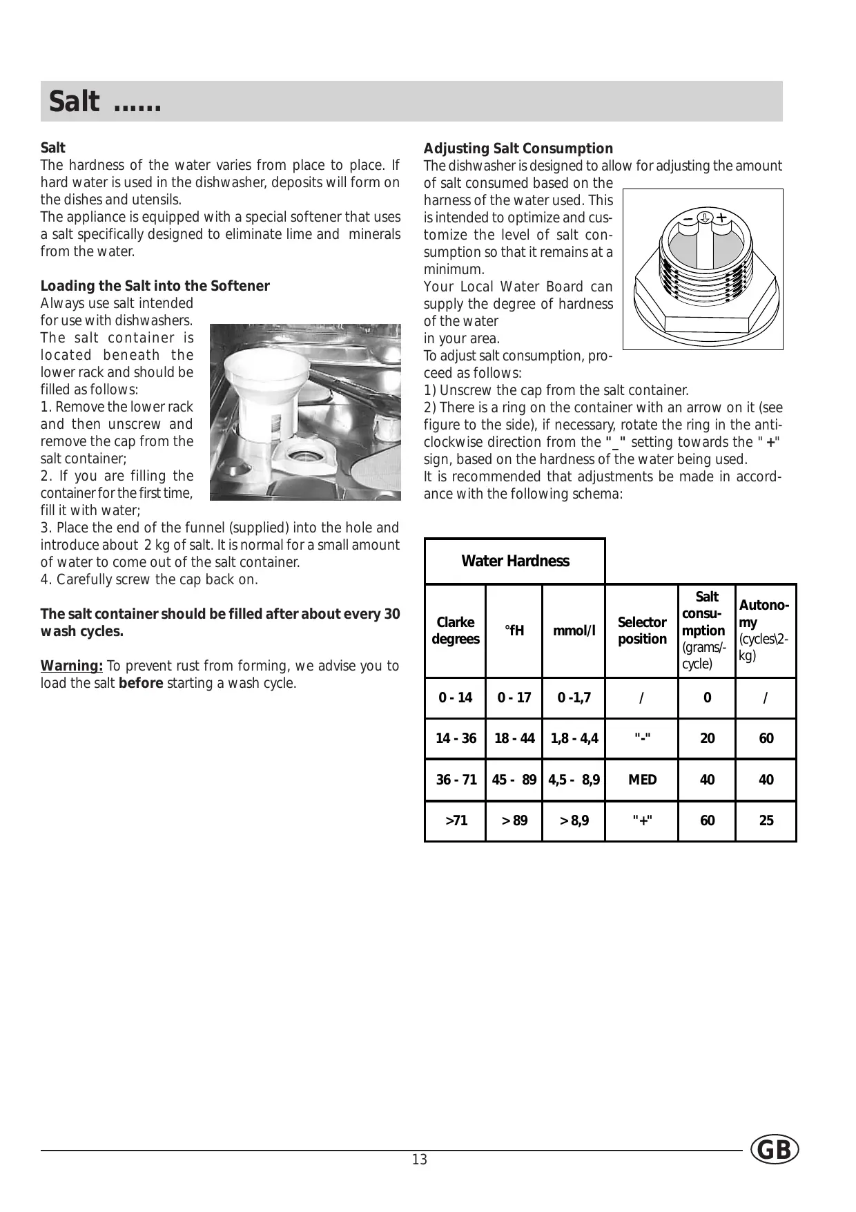 Water Hardness ot Autono- Cleske °fH mmol/l Selector mption my degrees position (cycles\2- (grams/- kg) cycle) 0-14 | 0-17 | 0-17 l 0 (l 14-36 | 18-44 | 18-4,4 "" 20 60 36-71 | 45- 89|4,5- 8,9 MED 40 >71 >89 >8,9 25