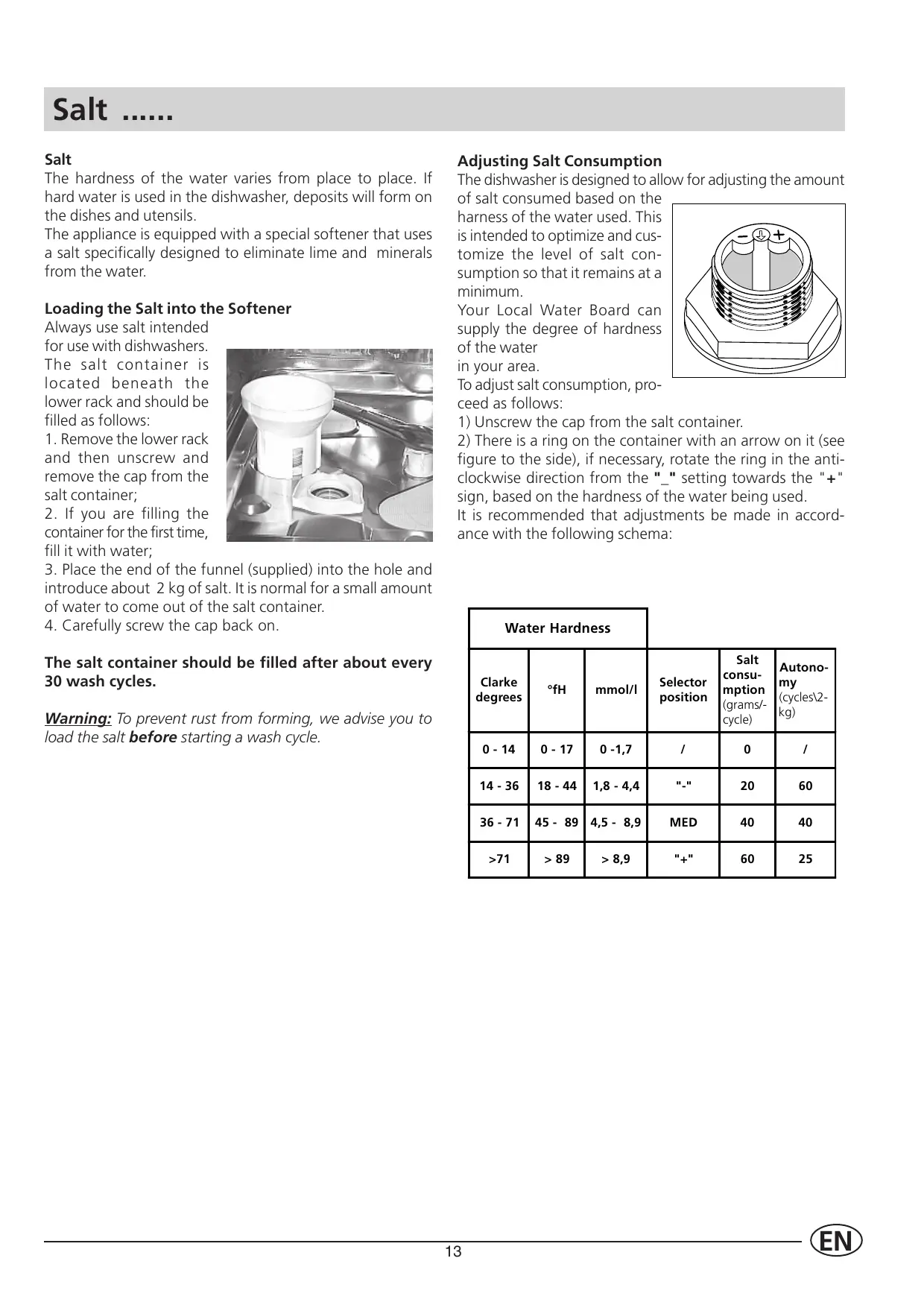 figure to the side), if necessary, rotate the ring in the anticlockwise direction from the "_" setting towards the "+" sign, based on the hardness of the water being used. It is recommended that adjustments be made in accordance with the following schema: Water Hardness The salt container should be filled after about every 30 wash cycles.