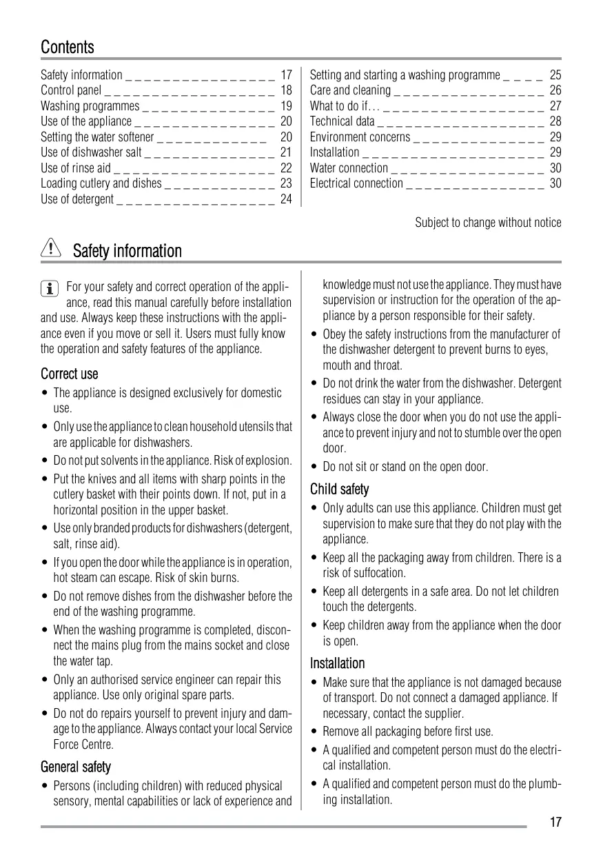 knowledge must not use the appliance. They must have supervision or instruction for the operation of the appliance by a person responsible for their safety. Obey the safety instructions from the manufacturer of the dishwasher detergent to prevent burns to eyes, mouth and throat. Do not drink the water from the dishwasher. Detergent residues can stay in your appliance. Always close the door when you do not use the appliance to prevent injury and not to stumble over the open door. Do not sit or stand on the open door. Child safety