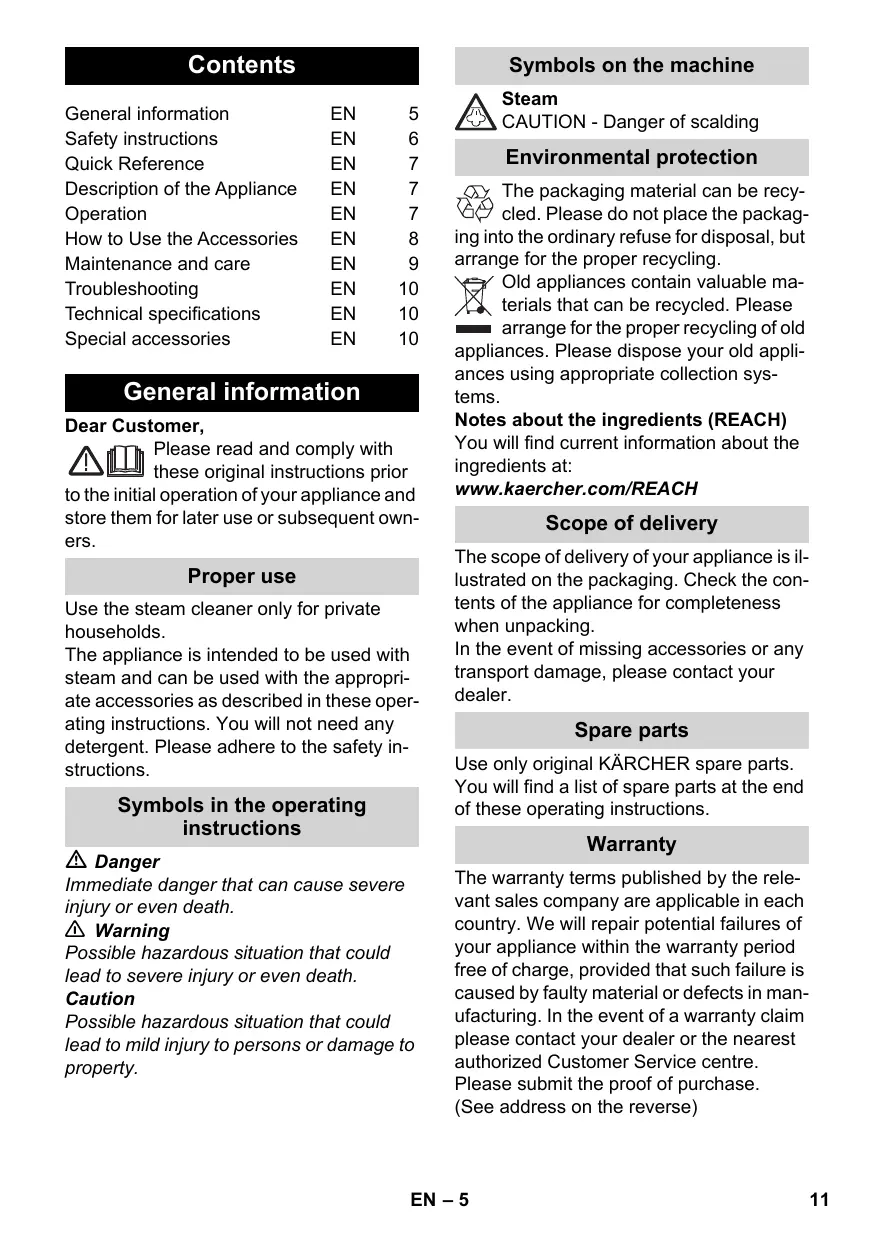r.c wi om n! Contents General information Safety instructions Quick Reference Description of the Appliance Operation How to Use the Accessories Maintenance and care Troubleshooting Technical specifications Special accessories General information Dear Customer, Please read and comply with these original instructions prior to the initial operation of your appliance and store them for later use or subsequent owners. Proper use Use the steam cleaner only for private households. The appliance is intended to be used with steam and can be used with the appropriate accessories as described in these operating instructions. You will not need any detergent. Please adhere to the safety instructions. Symbols in the operating instructions Danger Steam CAUTION - Danger of scalding Environmental protection The packaging material can be recycled. Please do not place the packaging into the ordinary refuse for disposal, but arrange for the proper recycling. Old appliances contain valuable materials that can be recycled. Please arrange for the proper recycling of old appliances. Please dispose your old appliances using appropriate collection systems. Notes about the ingredients (REACH) You will find current information about the ingredients at: www.kaercher.com/REACH Scope of delivery The scope of delivery of your appliance is illustrated on the packaging. Check the contents of the appliance for completeness when unpacking. In the event of missing accessories or any transport damage, please contact your dealer. Spare parts Use only original KÄRCHER spare parts. You will find a list of spare parts at the end of these operating instructions. Warranty Immediate danger that can cause severe injury or even death. 몇 Warning Possible hazardous situation that could lead to severe injury or even death. Caution Possible hazardous situation that could lead to mild injury to persons or damage to property. The warranty terms published by the relevant sales company are applicable in each country. We will repair potential failures of your appliance within the warranty period free of charge, provided that such failure is caused by faulty material or defects in manufacturing. In the event of a warranty claim please contact your dealer or the nearest authorized Customer Service centre. Please submit the proof of purchase. (See address on the reverse) EN – 5