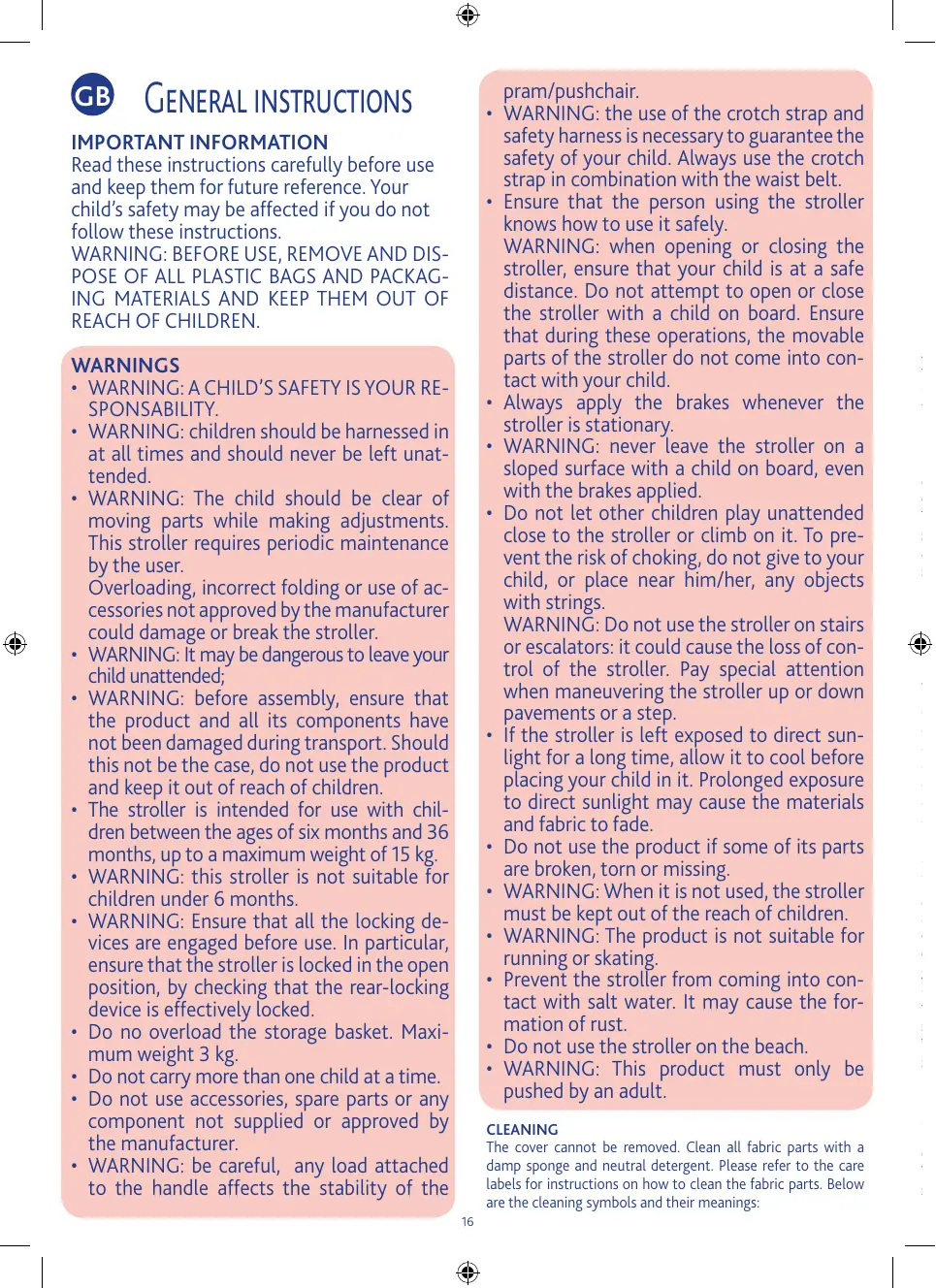 • AVERTISSEMENT : ne pas utilisier ce produit en faisant du jogging ou des promenadesen rollers. • Éviter le contact de la poussette avec de l’eau salée afin de prévenir la formation de rouille. • Ne pas utiliser la poussette à la plage. • AVERTISSEMENT : ce produit doit être utilisé uniquement par un adulte.