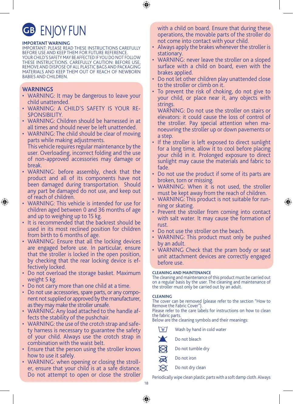 The cleaning and maintenance of this product must be carried out on a regular basis by the user. The cleaning and maintenance of the stroller must only be carried out by an adult. CLEANING The cover can be removed (please refer to the section “How to Remove the Fabric Cover”). Please refer to the care labels for instructions on how to clean the fabric parts. Below are the cleaning symbols and their meanings: Wash by hand in cold water Do not bleach Do not tumble dry Do not iron Do not dry clean Periodically wipe clean plastic parts with a soft damp cloth. Always