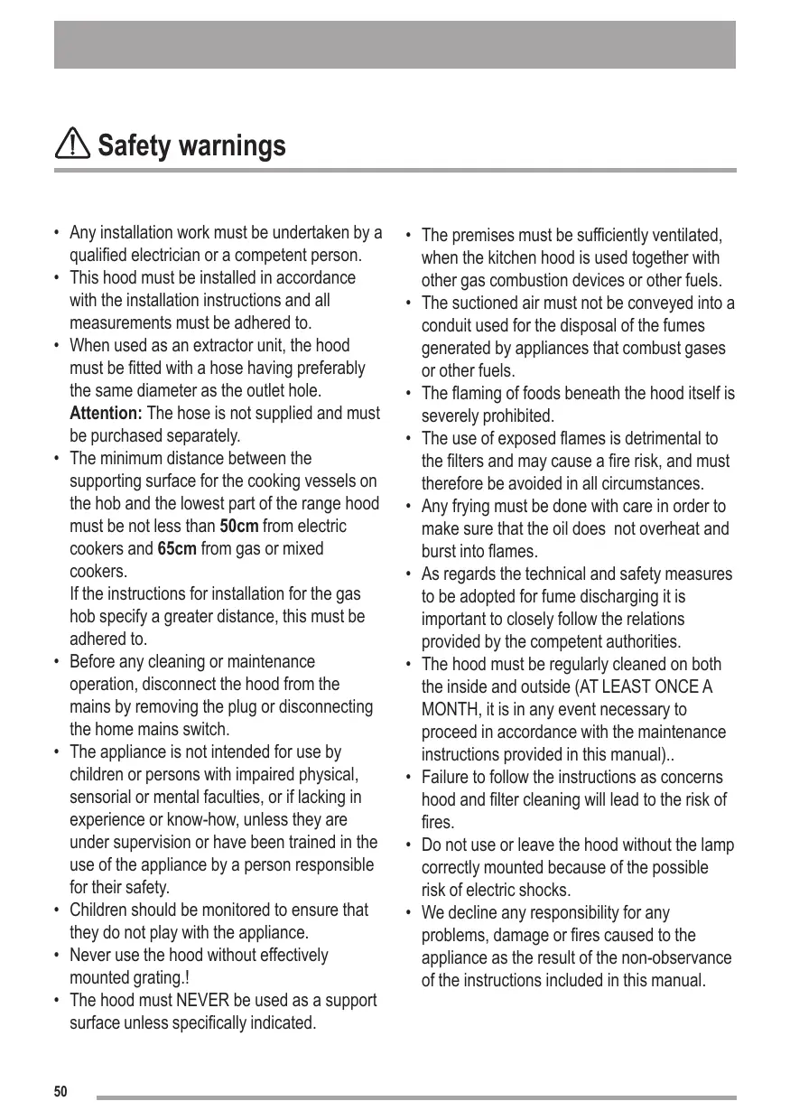 Safety warnings • Any installation work must be undertaken by a qualified electrician or a competent person. • This hood must be installed in accordance with the installation instructions and all measurements must be adhered to. • When used as an extractor unit, the hood must be fitted with a hose having preferably the same diameter as the outlet hole. Attention: The hose is not supplied and must be purchased separately. • The minimum distance between the supporting surface for the cooking vessels on the hob and the lowest part of the range hood must be not less than 50cm from electric cookers and 65cm from gas or mixed cookers. If the instructions for installation for the gas hob specify a greater distance, this must be adhered to. • Before any cleaning or maintenance operation, disconnect the hood from the mains by removing the plug or disconnecting the home mains switch. • The appliance is not intended for use by children or persons with impaired physical, sensorial or mental faculties, or if lacking in experience or know-how, unless they are under supervision or have been trained in the use of the appliance by a person responsible for their safety. • Children should be monitored to ensure that they do not play with the appliance. • Never use the hood without effectively mounted grating.! • The hood must NEVER be used as a support surface unless specifically indicated.