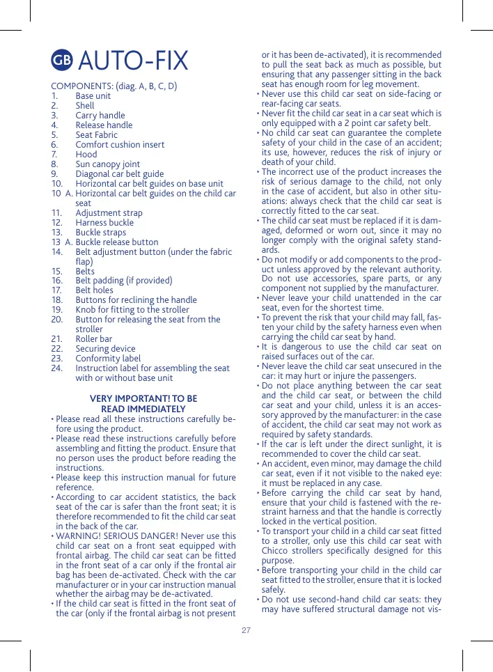 • Please read all these instructions carefully before using the product. • Please read these instructions carefully before assembling and fitting the product. Ensure that no person uses the product before reading the instructions. • Please keep this instruction manual for future reference. • According to car accident statistics, the back seat of the car is safer than the front seat; it is therefore recommended to fit the child car seat in the back of the car. • WARNING! SERIOUS DANGER! Never use this child car seat on a front seat equipped with frontal airbag. The child car seat can be fitted in the front seat of a car only if the frontal air bag has been de-activated. Check with the car manufacturer or in your car instruction manual whether the airbag may be de-activated. • If the child car seat is fitted in the front seat of the car (only if the frontal airbag is not present 27