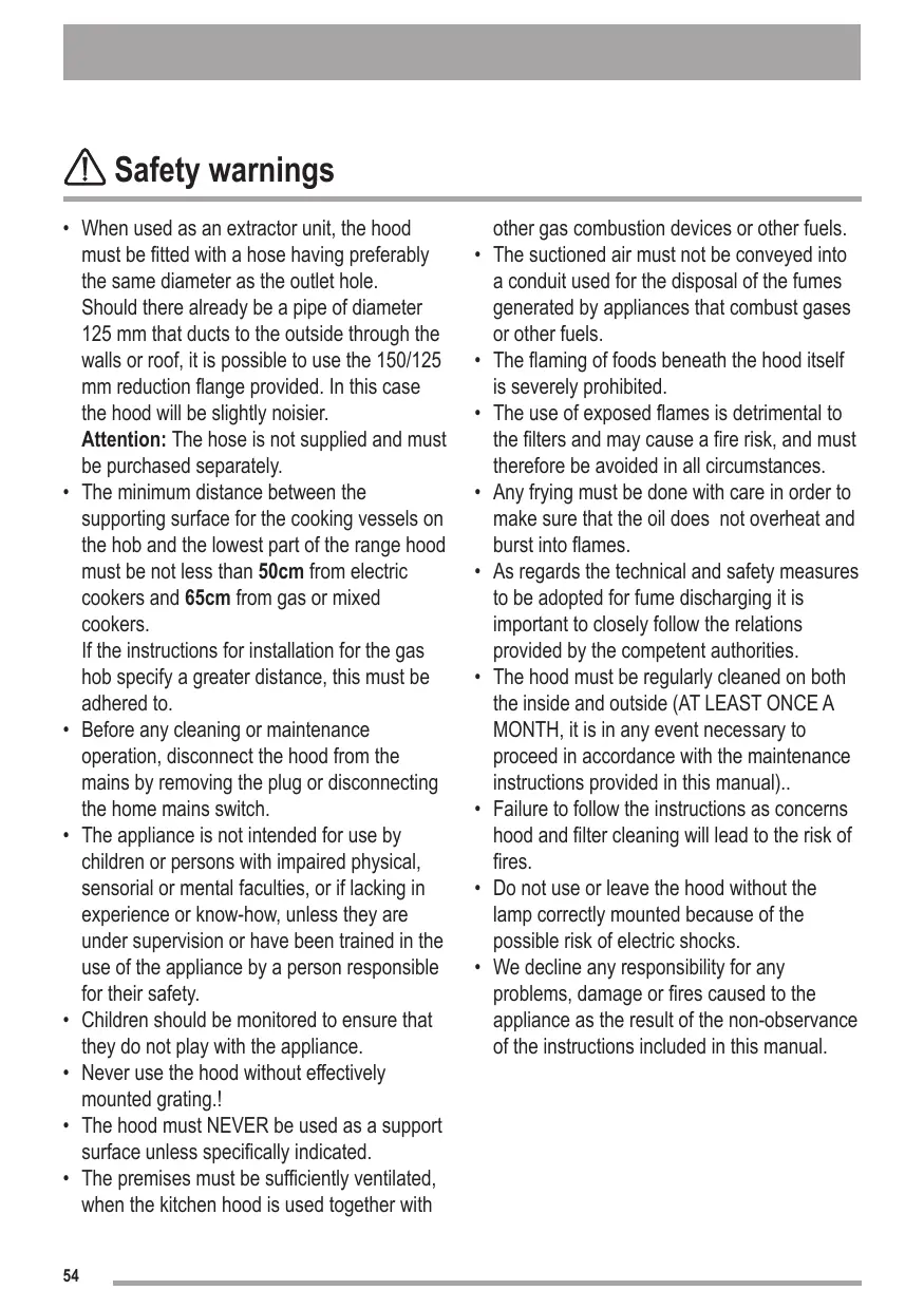 Safety warnings • When used as an extractor unit, the hood must be fitted with a hose having preferably the same diameter as the outlet hole. Should there already be a pipe of diameter 125 mm that ducts to the outside through the walls or roof, it is possible to use the 150/125 mm reduction flange provided. In this case the hood will be slightly noisier. Attention: The hose is not supplied and must be purchased separately. • The minimum distance between the supporting surface for the cooking vessels on the hob and the lowest part of the range hood must be not less than 50cm from electric cookers and 65cm from gas or mixed cookers. If the instructions for installation for the gas hob specify a greater distance, this must be adhered to. • Before any cleaning or maintenance operation, disconnect the hood from the mains by removing the plug or disconnecting the home mains switch. • The appliance is not intended for use by children or persons with impaired physical, sensorial or mental faculties, or if lacking in experience or know-how, unless they are under supervision or have been trained in the use of the appliance by a person responsible for their safety. • Children should be monitored to ensure that they do not play with the appliance. • Never use the hood without effectively mounted grating.! • The hood must NEVER be used as a support surface unless specifically indicated. • The premises must be sufficiently ventilated, when the kitchen hood is used together with 54