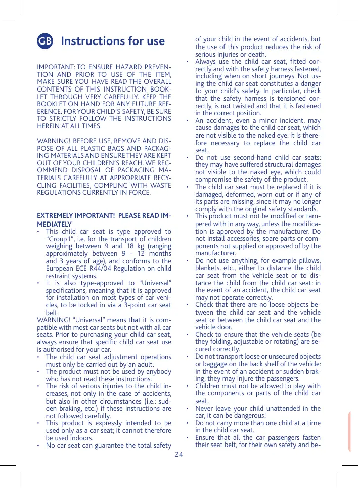 EXTREMELY IMPORTANT! PLEASE READ IMMEDIATELY • This child car seat is type approved to “Group1”, i.e. for the transport of children weighing between 9 and 18 kg (ranging approximately between 9 - 12 months and 3 years of age), and conforms to the European ECE R44/04 Regulation on child restraint systems. • It is also type-approved to “Universal” specifications, meaning that it is approved for installation on most types of car vehicles, to be locked in via a 3-point car seat belt. WARNING! “Universal” means that it is compatible with most car seats but not with all car seats. Prior to purchasing your child car seat, always ensure that specific child car seat use is authorised for your car. • The child car seat adjustment operations must only be carried out by an adult. • The product must not be used by anybody who has not read these instructions. • The risk of serious injuries to the child increases, not only in the case of accidents, but also in other circumstances (i.e.: sudden braking, etc.) if these instructions are not followed carefully. • This product is expressly intended to be used only as a car seat; it cannot therefore be used indoors. • No car seat can guarantee the total safety