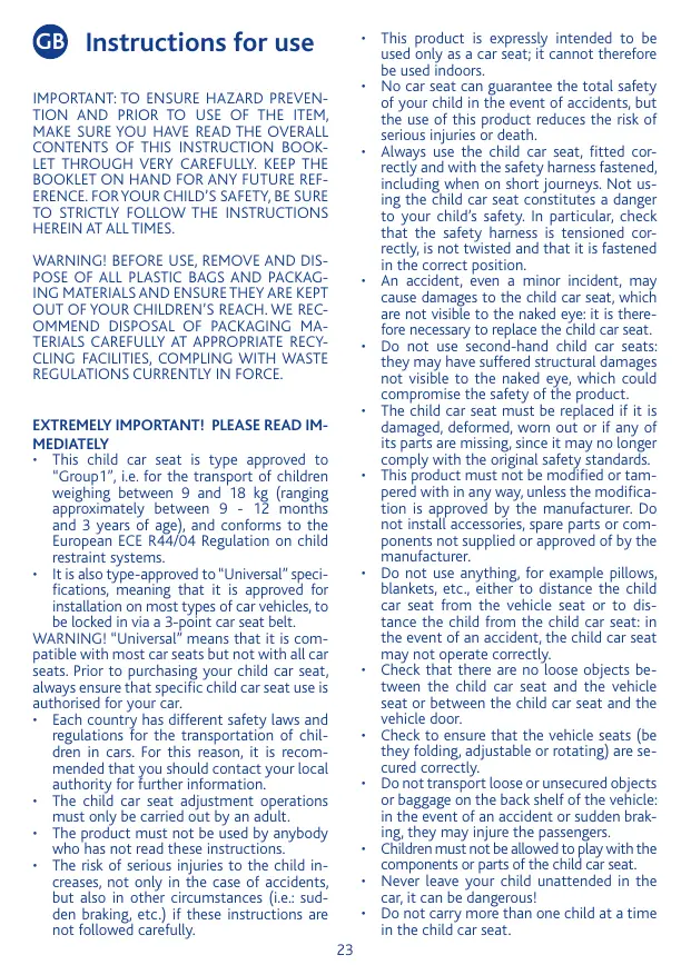 • Ce siège-auto est homologué “Universel” et peut donc être installé sur la quasi totalité des véhicules en l’accrochant à l’aide de la ceinture à trois points du siège de la voiture. ATTENTION ! “Universel” signifie qu’il est compatible avec la plupart des véhicules – ce qui ne signifie pas tous les véhicules. Il faut donc vérifier la compatibilité du siège-auto avec votre voiture avant l’achat. • Chaque pays a des lois et des règlements différents en matière de sécurité pour le transport des enfants en voiture. Par conséquent, il est conseillé de contacter les autorités locales pour plus d’informations. • Le réglage du siège-auto doit être fait uniquement par un adulte. • Ne pas utiliser ce produit sans avoir préalablement lu les instructions. • Le risque de dommages graves pour l’enfant augmente si les indications de cette notice ne sont pas suivies scrupuleusement. Ce risque n’intervient pas uniquement en cas d’accident, mais aussi dans d’autres situations (ex. freinages brusques, etc.). • Le produit est exclusivement destiné à